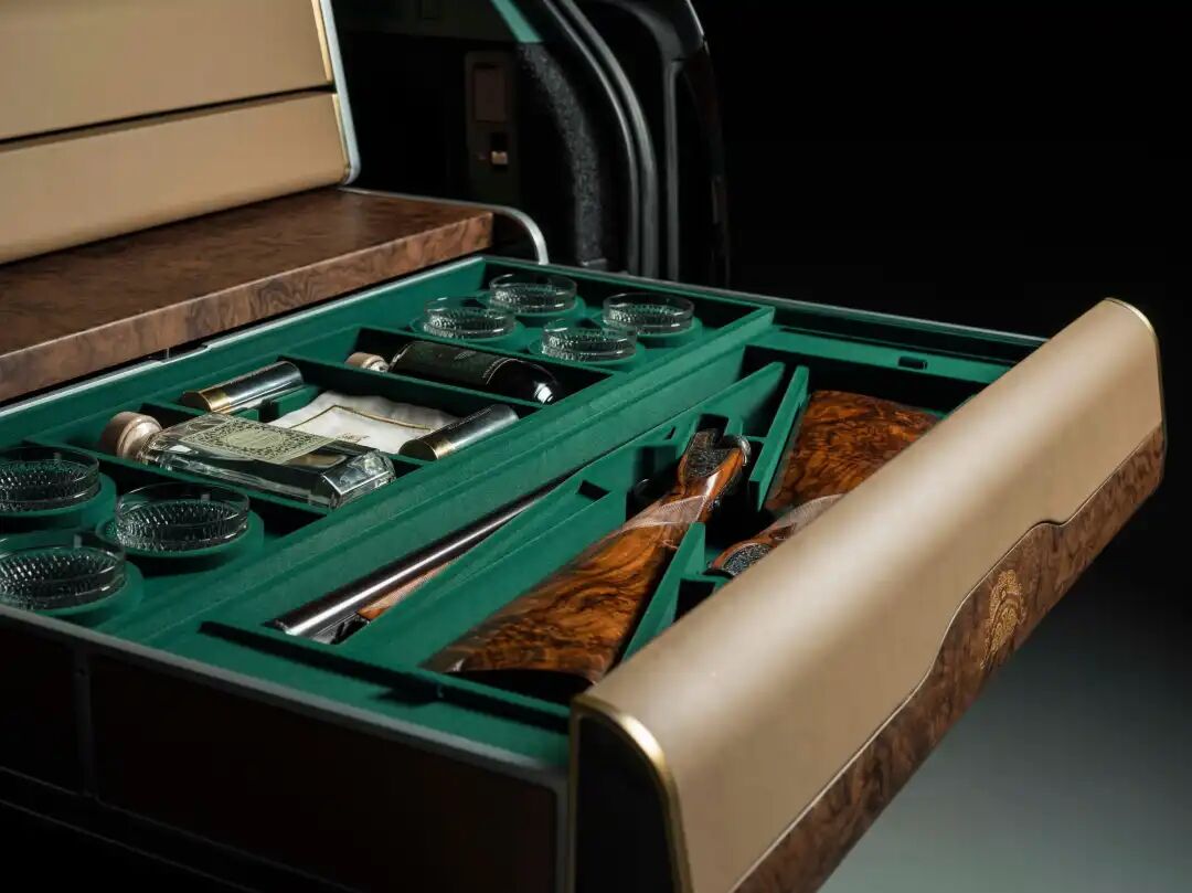 不过,这款车与枪械最直接的联系体现在后备厢。买家可选装一系列内置储物箱,Overfinch将其称为“随行储物箱”。上层箱体可容纳两瓶香槟以及水晶香槟杯、餐盘和全套餐具(后排座椅之间还配有香槟冷藏箱)。