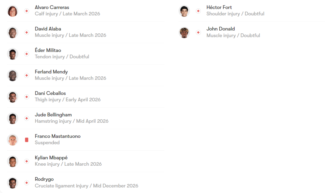 皇马面临欧冠与西甲双线作战压力,3月18日需客场挑战曼城进行欧冠次回合,本场联赛大概率有所保留,避免主力球员受伤或体能透支。伤病方面,皇马残阵出击,姆巴佩、贝林厄姆、罗德里戈等7名主力缺阵,进攻端创造力大幅下滑,仅靠维尼修斯单点突破难以持续撕裂密集防线。埃尔切虽有3名轮换球员伤缺,但主力框架完整,无核心停赛影响,352阵型的防守协同性不受太大冲击,相比皇马的阵容残缺更具稳定性。