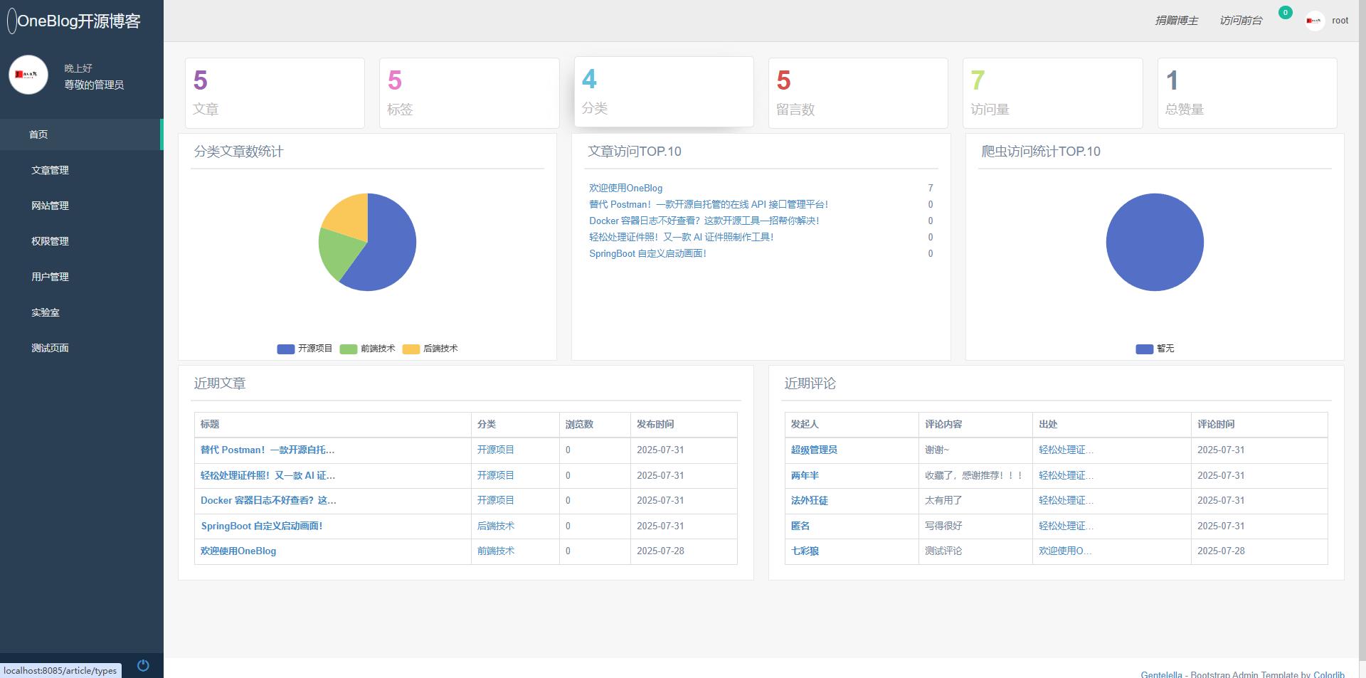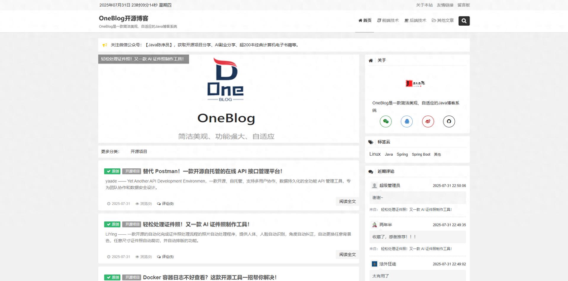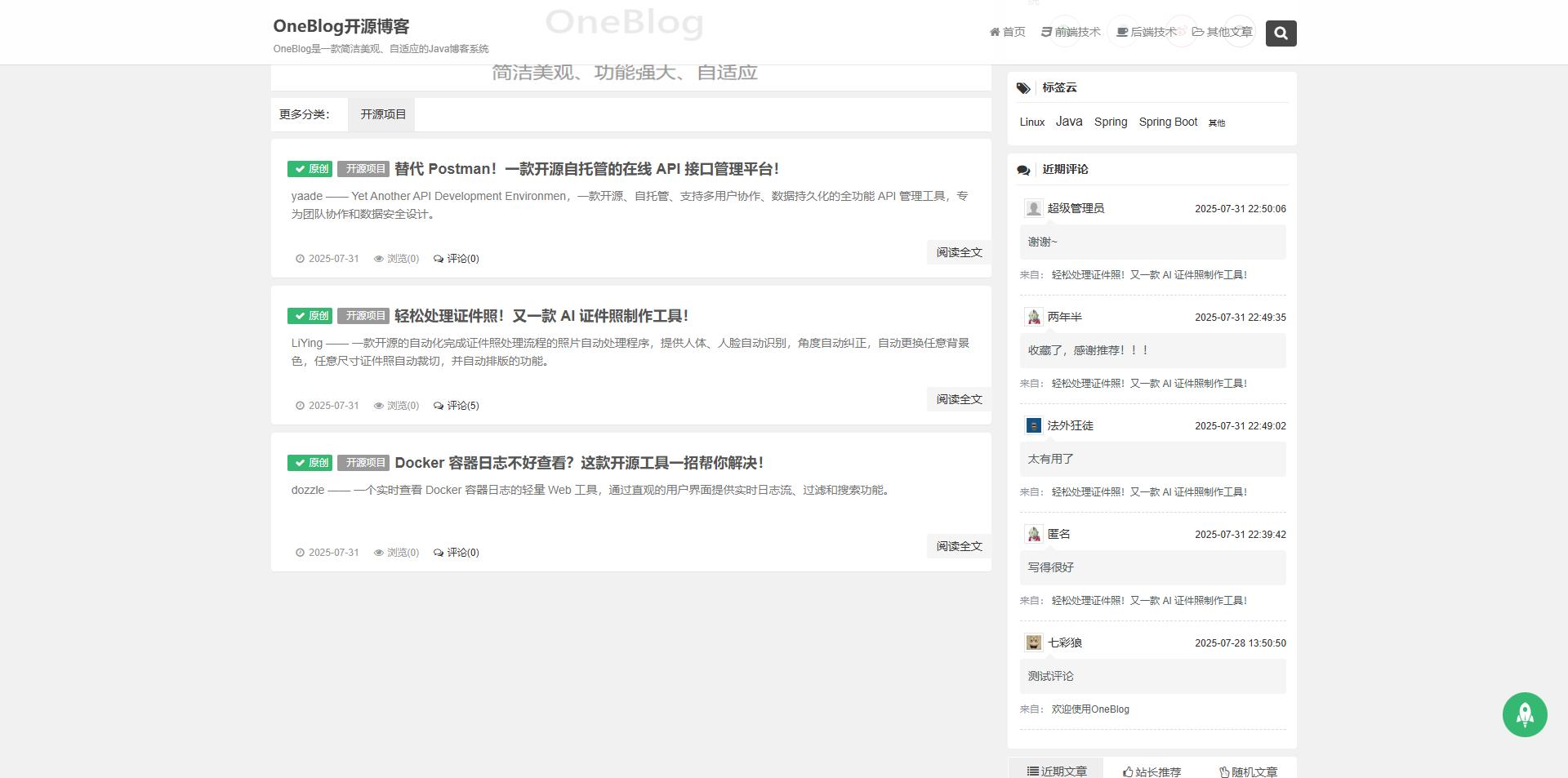 项目介绍OneBlog —— 一个简洁美观、功能强大并且自适应的 Java 博客。基于 SpringBoot + Bootstrap 开发,支持移动端自适应,配有完备的前台和后台管理功能。