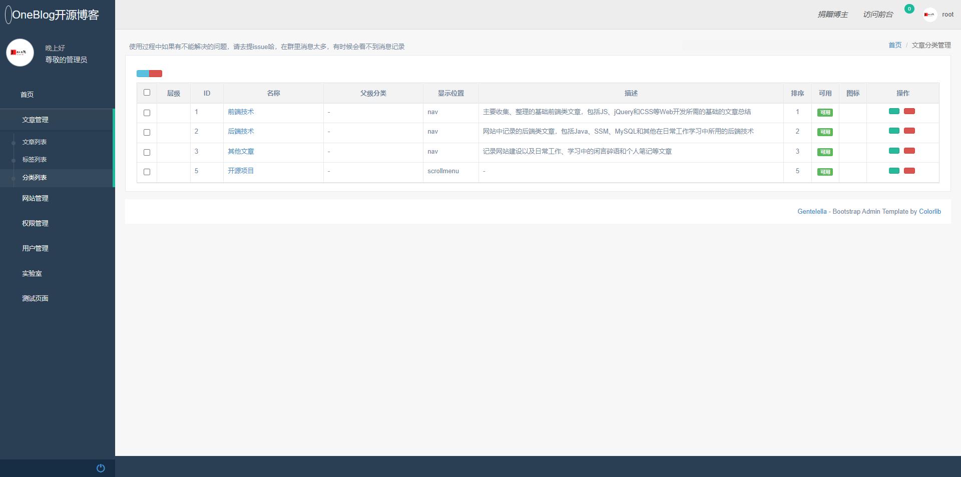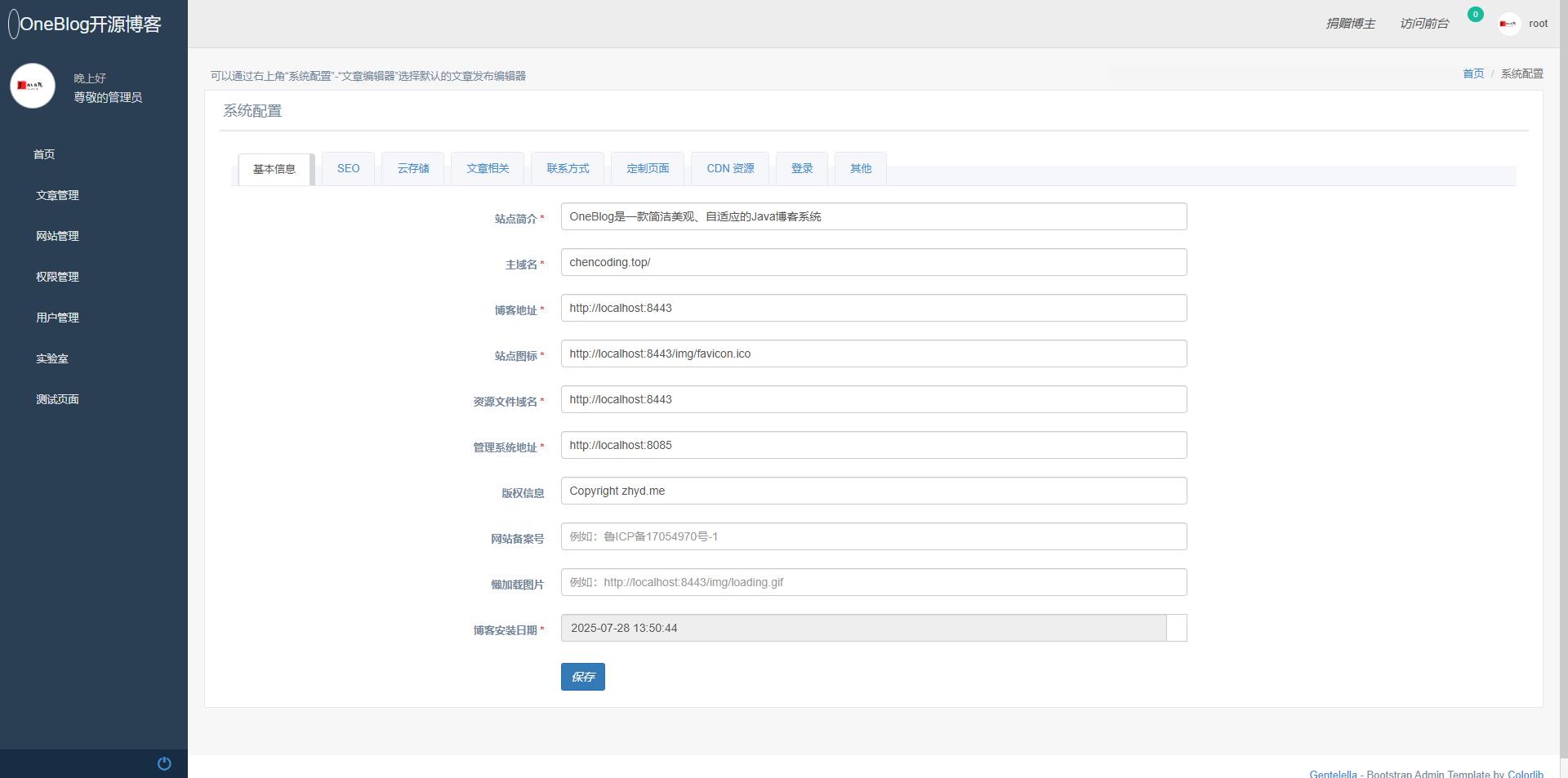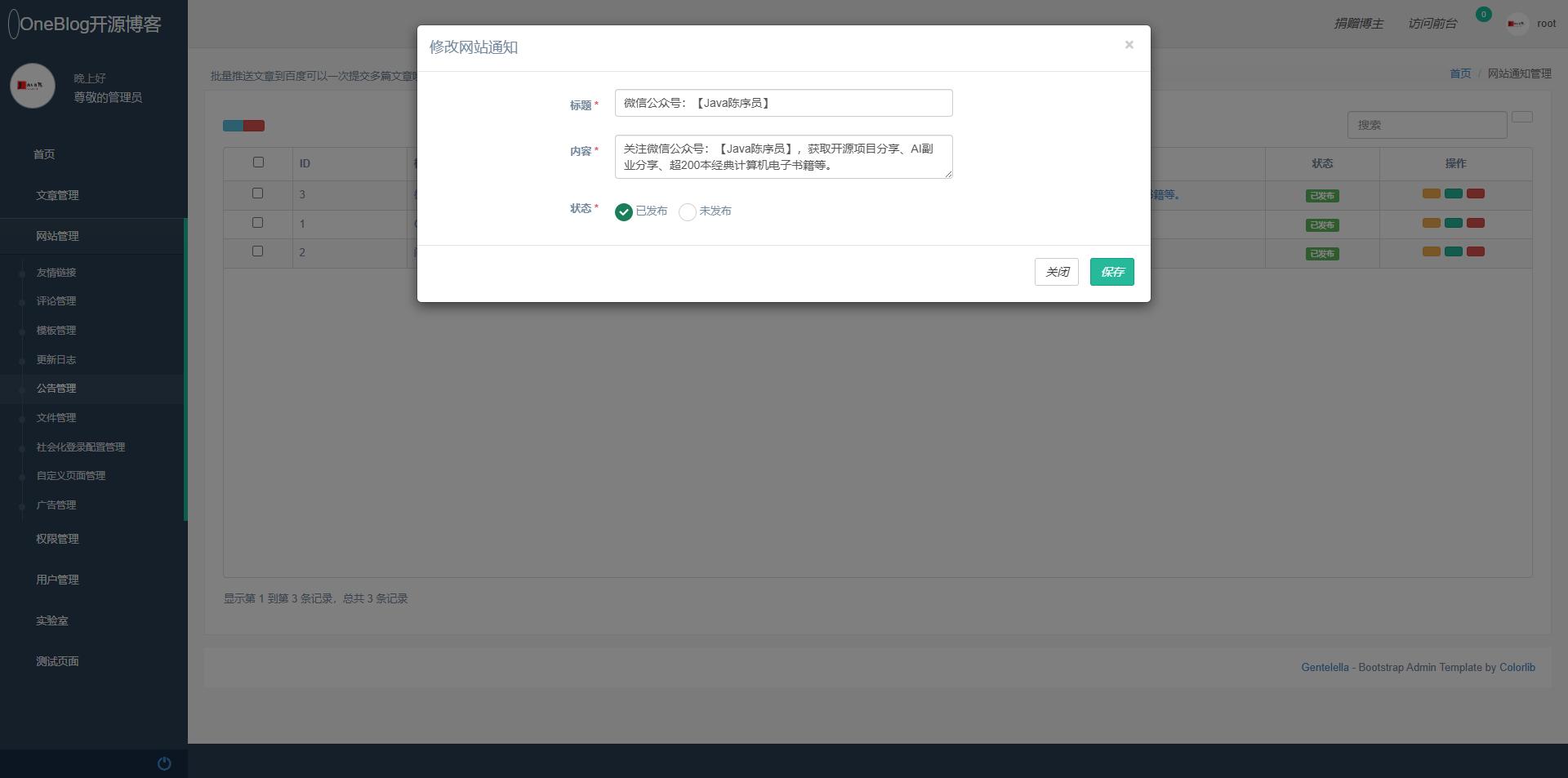 项目介绍OneBlog —— 一个简洁美观、功能强大并且自适应的 Java 博客。基于 SpringBoot + Bootstrap 开发,支持移动端自适应,配有完备的前台和后台管理功能。