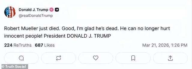 特朗普就米勒去世在社交媒体上发文表示,“很好,我很高兴他死了。他再也不能伤害无辜的人了。”