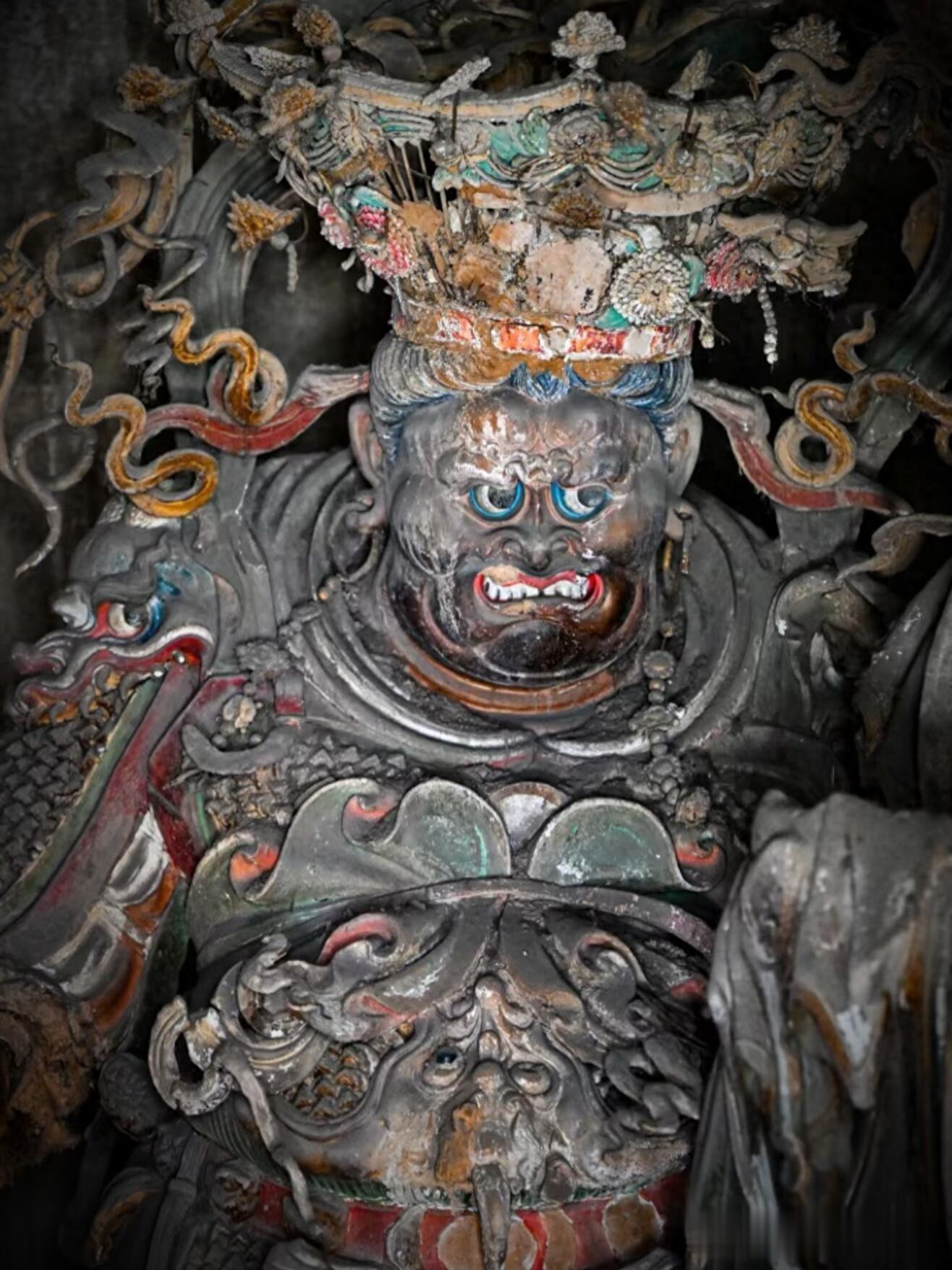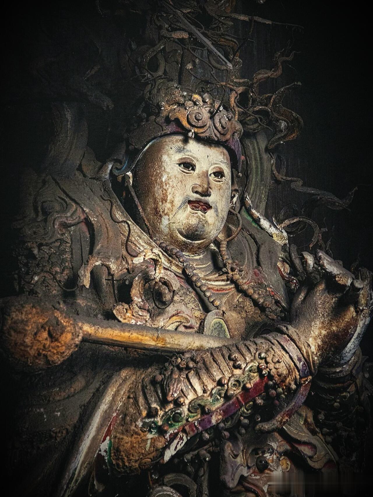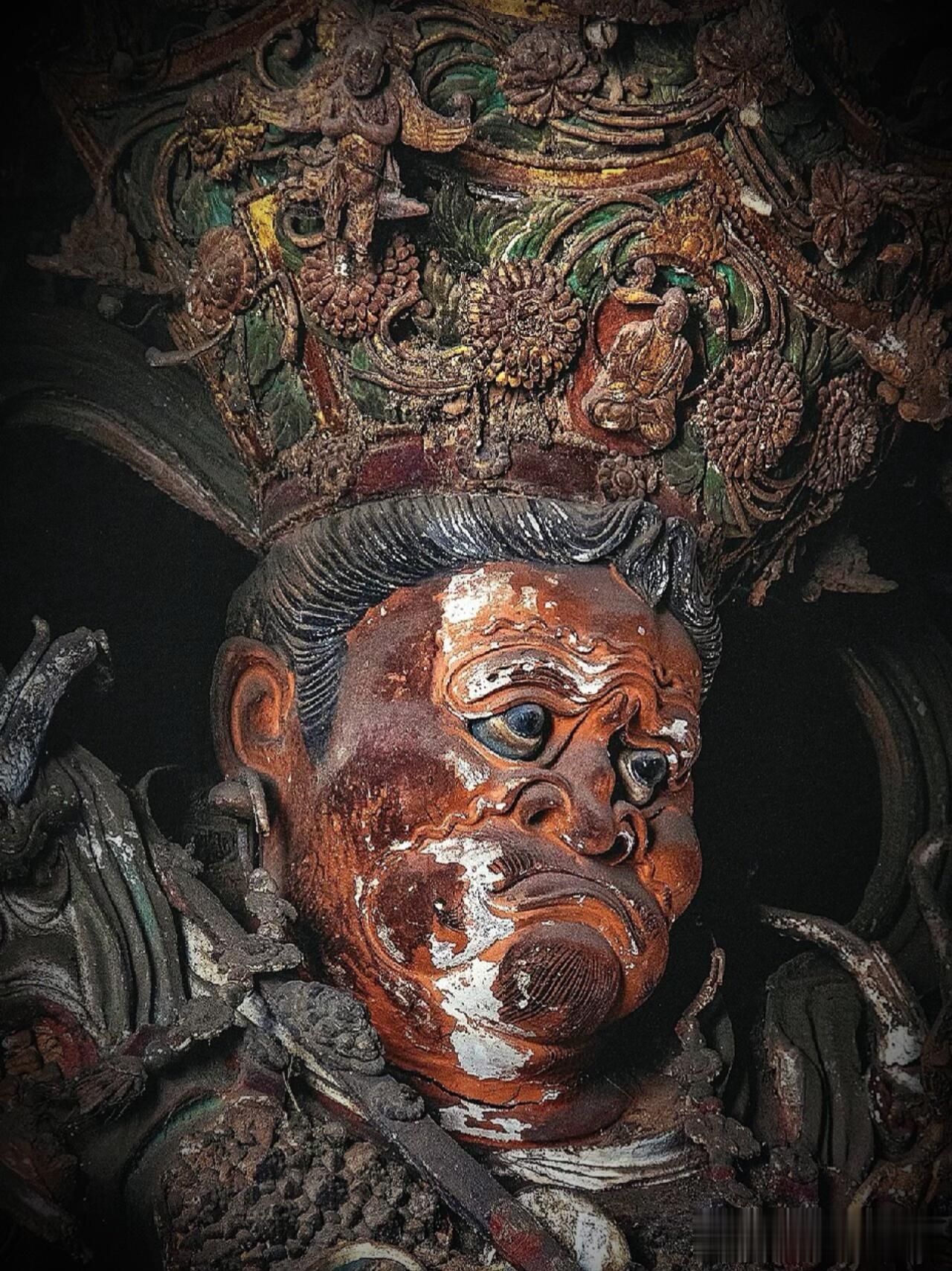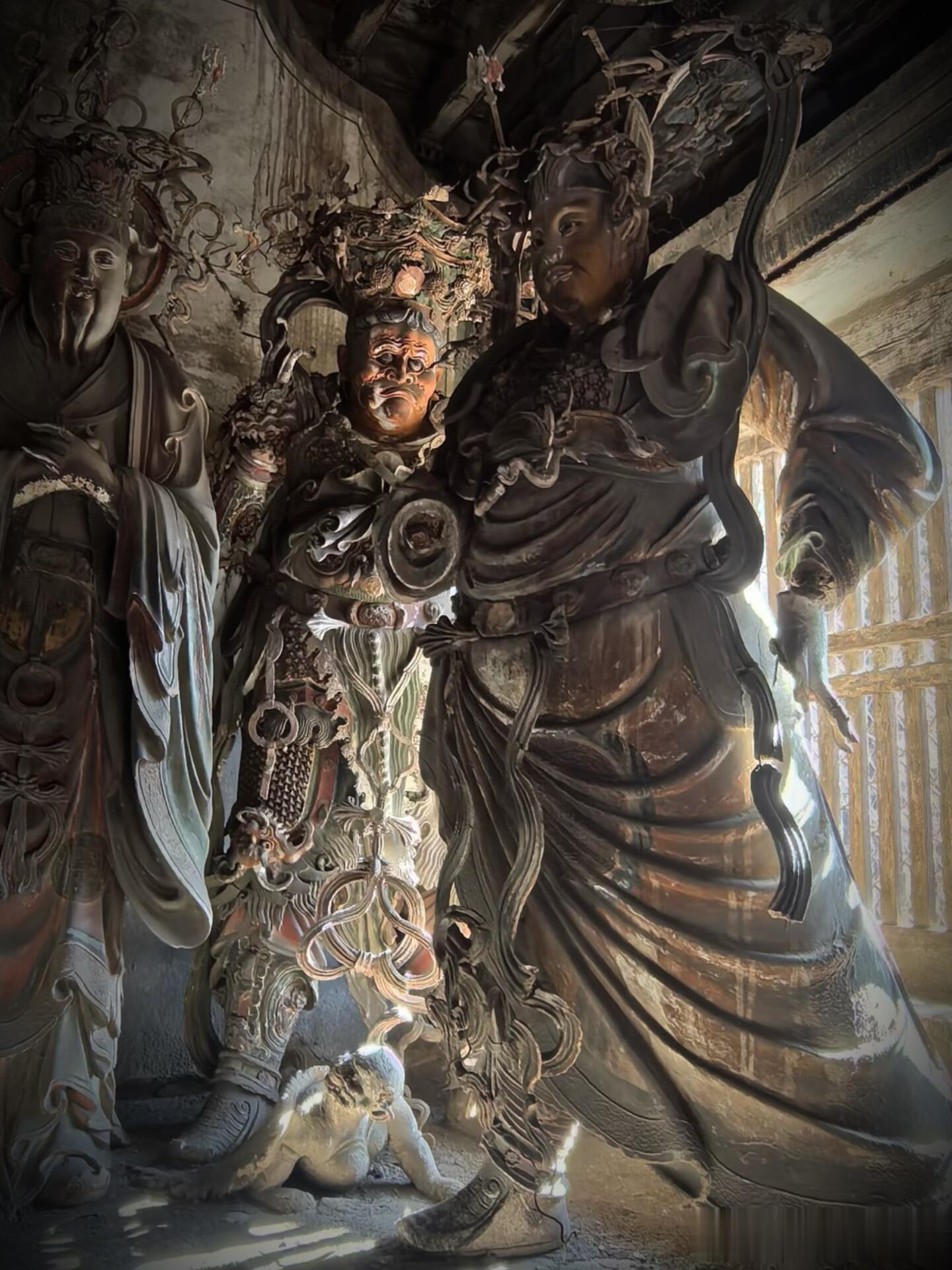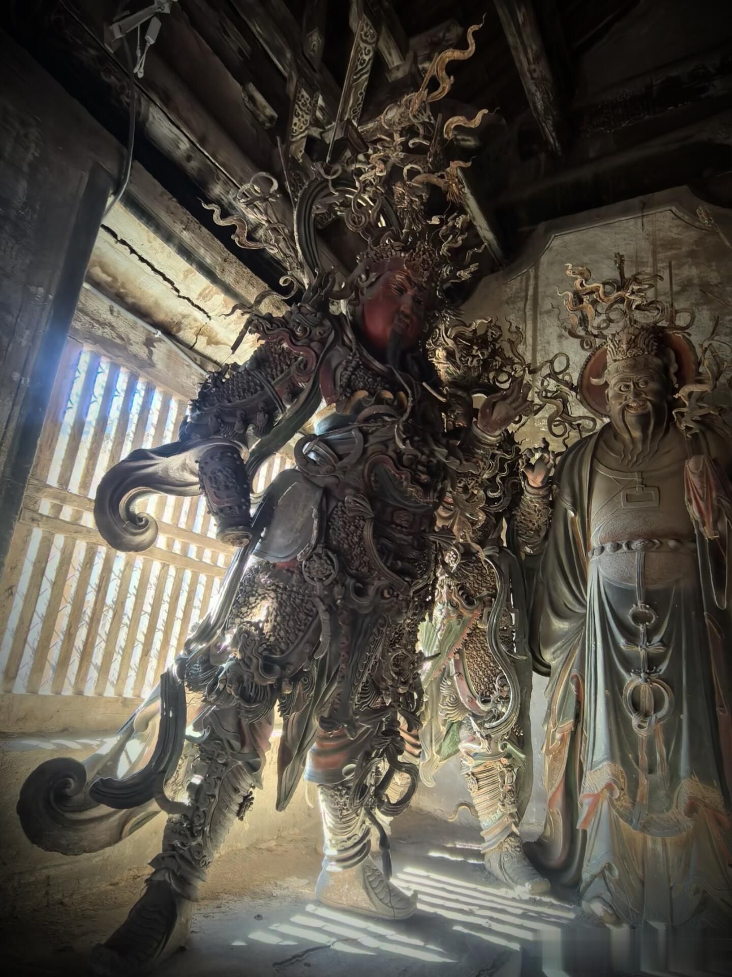 工艺上的独创,更是铁佛寺立足的底气。别处的彩塑,多以木骨为架,泥草为胎,造型偏于规整柔和,而铁佛寺的工匠,直接把当地发达的冶铁技术用在了造像上,创造出独一份的铁骨泥胎技法。以木为主架,以铁丝为筋骨,细如发丝的铁线,弯转折叠,随心所欲,用来塑须发、飘带、铠甲、纹饰,再敷以泥胎,施彩贴金。铁丝的柔韧,是木骨永远比不了的,它能让一缕发丝根根倒竖,能让一片飘带凌空飞举,能让铠甲鳞片层层叠叠,边缘锋利如真,能让装饰纹样繁复到极致,却丝毫不显臃肿。每一处细节都被拉满,每一根线条都充满张力,静态的塑像,因此有了动态的狂放。你凑近看,能看到铁丝撑起的肌肉线条,能摸到铠甲上锋利的棱角,能感受到衣袂翻飞的力度,这种刚柔并济的质感,是传统泥塑永远无法企及的。高平自古产铁,工匠们就地取材,把乡土技艺与宗教造像结合,没有照搬范本,没有墨守成规,用最接地气的材料,做出了最超凡的艺术。