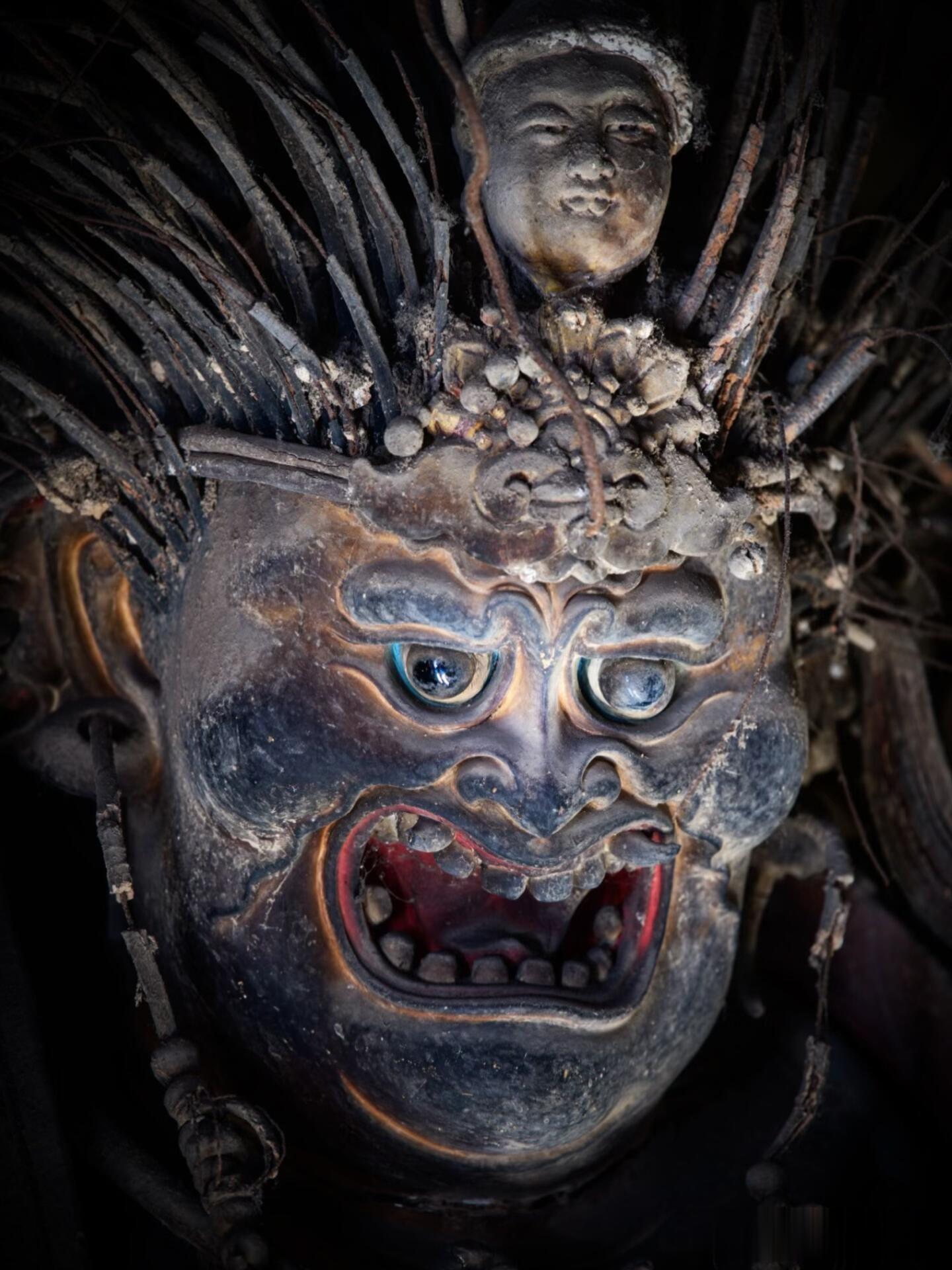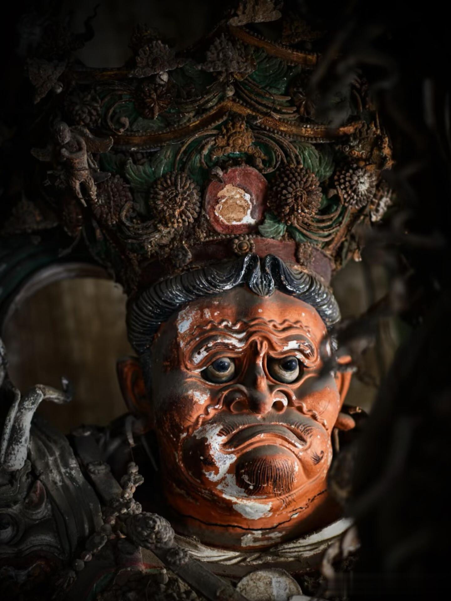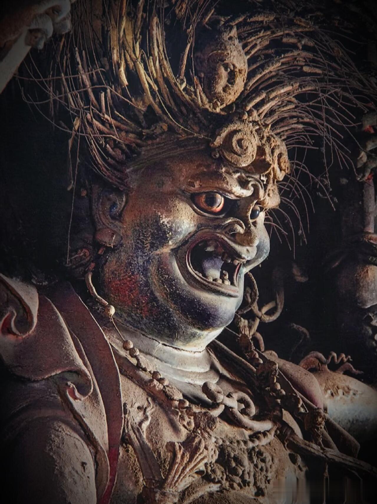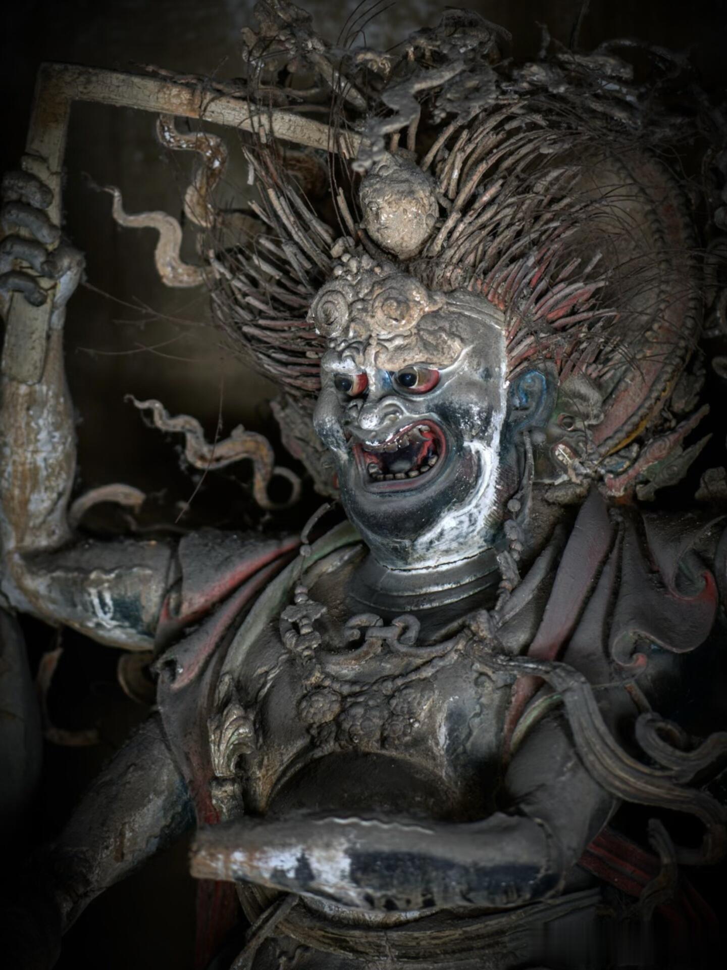而最珍贵的,是工匠们彻底打破了审美枷锁。主流的宗教造像,大多面容慈悲,神态宁静,姿态规整,千佛一面,是标准化的庄严。铁佛寺的工匠偏不,他们抛弃所有既定范式,把世俗的观察、人性的复杂、大胆的想象,全都灌注进每一尊造像里。这里没有温和的笑,没有低垂的眼,大多是怒目圆睁,眉骨高耸,鼻梁挺直,嘴唇紧抿,有的面露凶相,有的神情冷峻,有的带着睥睨众生的傲气,有的藏着不容置喙的威严。他们不再是被符号化的神,而是有性格、有情绪、有力量的守护者。工匠们把人间的勇武、刚烈、桀骜,都揉进了神的面孔里,让每一尊造像都有独一无二的灵魂。没有两尊脸是重复的,没有两个姿态是雷同的,有的刚猛如战将,有的冷峻如判官,有的温婉中藏着锋芒,女性造像也不见柔媚,反而自带一股凛然不可侵犯的气场。这种狞厉之美,粗粝、直白、充满生命力,不迎合,不讨好,不取悦任何人,只是忠于创作,忠于内心的表达。