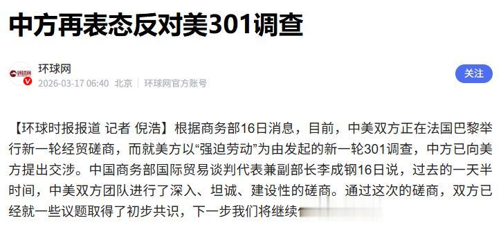 深夜立下铁律3月16日深夜,当全球媒体还在猜测谈判结果时,中方通告已至,字数不多,却字字千钧,没有客套,没有模糊地带,直接划出两条红线:拒绝单边关税,终止301调查。