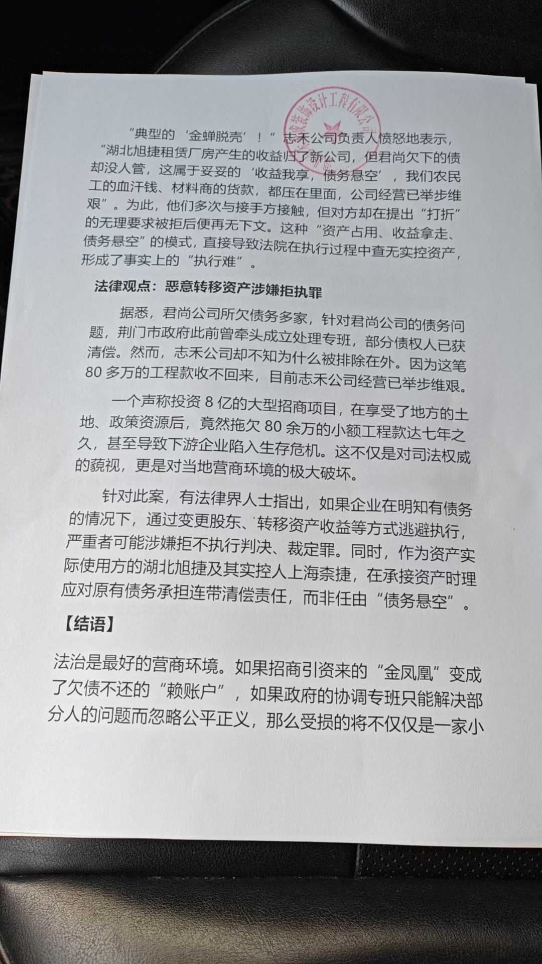 据悉,君尚公司所欠债务多家,针对君尚公司的债务问题,荆门市政府此前曾牵头成立处理专班,部分债权人已获清偿。然而,志禾公司却不知为什么被排除在外。因为这笔80多万的工程款收不回来,目前志禾公司经营已举步维艰。