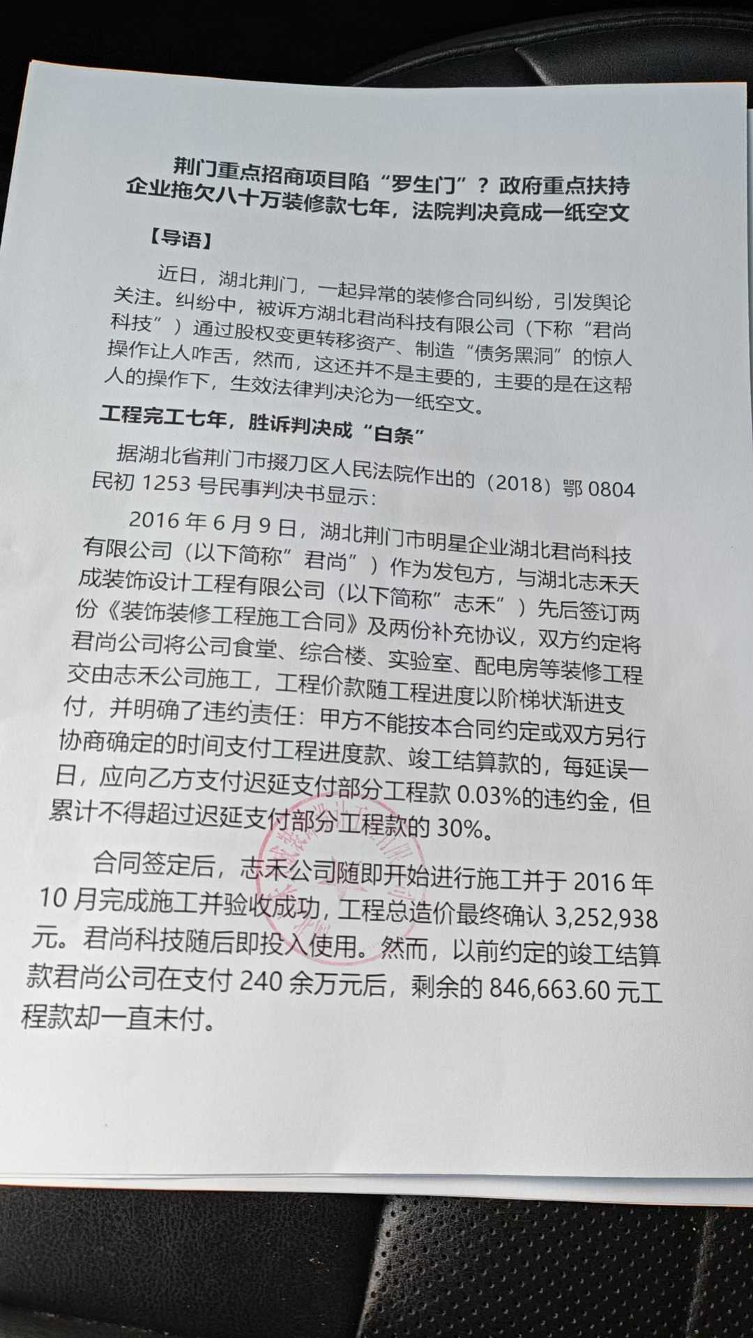 君尚公司项目为荆门市重点投资项目,项目投资额高达8亿,为了促成此项目的成功,荆门市政府在项目施工过程中给予了政策红利等大力扶持,投资高达8亿元的招商引资重点项目,连80多万的装修工程款都无力支付?这让志禾公司无论如何也难以接受,数次讨要无果后,志禾公司将君尚公司告上了法庭,而法庭也在基于事实和法律的基础上,于2018年11月12日公正判决志禾公司胜诉,要求君尚公司被告湖北君尚科技有限公司支付原告湖北志禾天成装饰设计工程有限公司工程款846663.60元及自2017年4月1日起计算至清偿之日止违约金253999.08元。