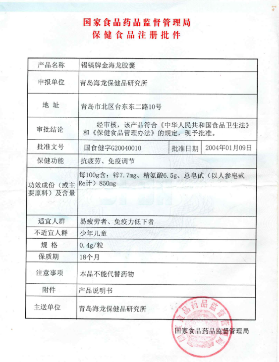 动力仁“锡镐牌金海龙胶囊”(批准文号:国食健字G20040010)是一款经国家市场监督管理总局批准的保健食品,其获批保健功能为“缓解体力疲劳”,适宜人群为“易疲劳者”,不适宜人群包括少年儿童、孕妇及乳母。