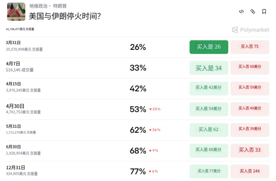 3月31日以前停火的概率昨天早上还在13-14%,美股盘后变成26%。