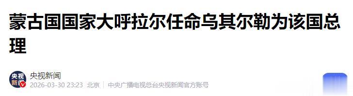3月30日晚上,蒙古国国家大呼拉尔春季全体会议上,乌其尔勒正式上任,成为蒙古国新一届总理。