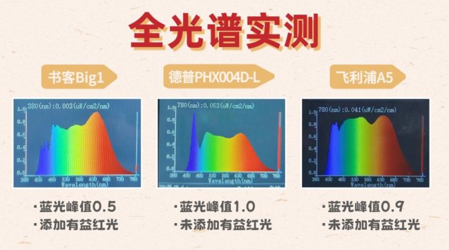 实测方法:在暗室环境下使用专业光谱仪测试各款灯具的光谱图,重点观察蓝光波段(415-455nm)的峰值强度、红光波段是否增强,以及整体光谱曲线的连续性。