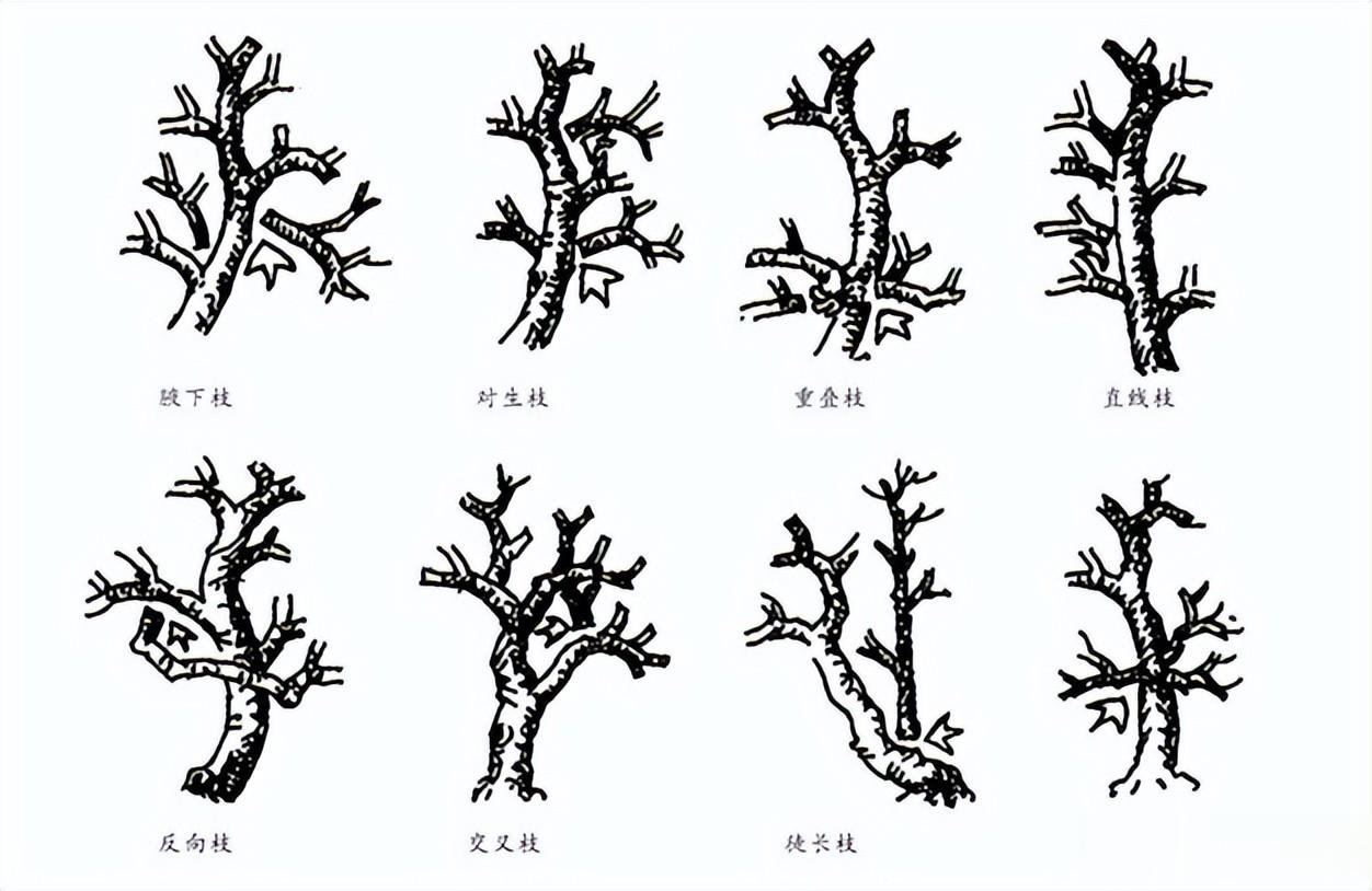 主枝蟠扎整形前,先将过密的和有碍观赏的枝条疏去或短截,经细致修剪后再用铝丝缠绕。树桩盆景造型忌平行枝、辐射枝、重叠枝、对生枝、交叉枝、顶心枝、反向枝、扁担枝、腋下枝、直线枝、徒长枝等(见图5)。