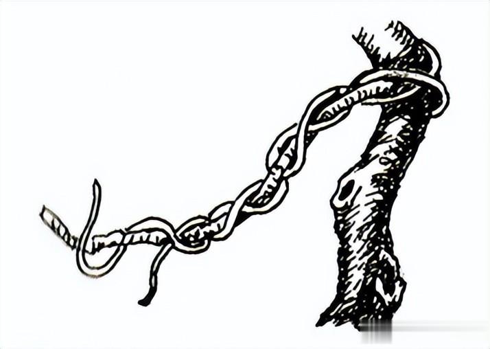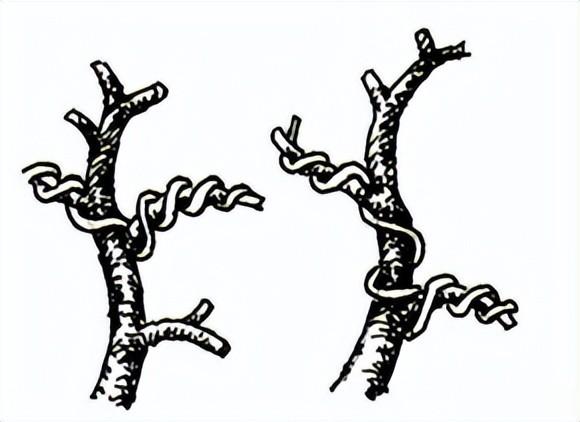 主枝蟠扎首先应该注意铝丝的着力点(见图6)。在枝干上随意搭头,就无着力点,但也不应该为了增加着力点而反复缠绕。在可能的情况下,一根铝丝横绕两枝,将铝丝的中段分别缠绕在邻近的两个主枝上,既省料又简便美观(见图7)。