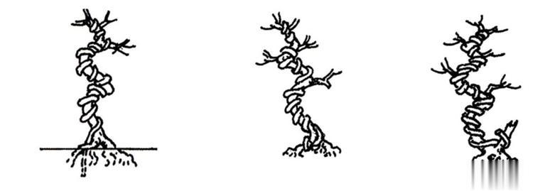 主干蟠扎通常是指对种植苗的造型,树苗长到直径1cm左右是最佳的造型时期,若再长粗,蟠扎造型困难得多。