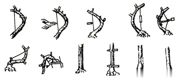 拿弯:缠好铝丝后开始拿弯。拿弯时,双手用拇指和食指、中指配合,反复缓慢揉压,使其木质部和韧皮部都得到一定程度的松动和锻炼,起到软化枝条的作用。先大弧度挤弯,然后重复压缩小弧度,以求达到造型要求。如果一开始就用力扭曲,可在拿弯时配合旋扭发力,使枝条渐弯且不易折断,即挺扭时,右手握住枝条上部,用力方向与铝丝缠绕方向相同,边旋边扭,此法运用熟练后效果也很好。拿弯有时木较脆,一次性达不到理想弯度,可分步拿弯,余下的一星期后再扭一次,或再过一星期再扭一次,如此反复,直到弯曲度达到理想要求为止。用力时如不慎将枝条折裂,可用电工胶布包裹缠绕几层,加以补救。如枝干太粗,而铝丝又偏细,可采用双股铝丝纳绕,以增加力度,也可以结合吊、拉、撑及用拿弯器,调整枝条的角度与方向(见图4)。