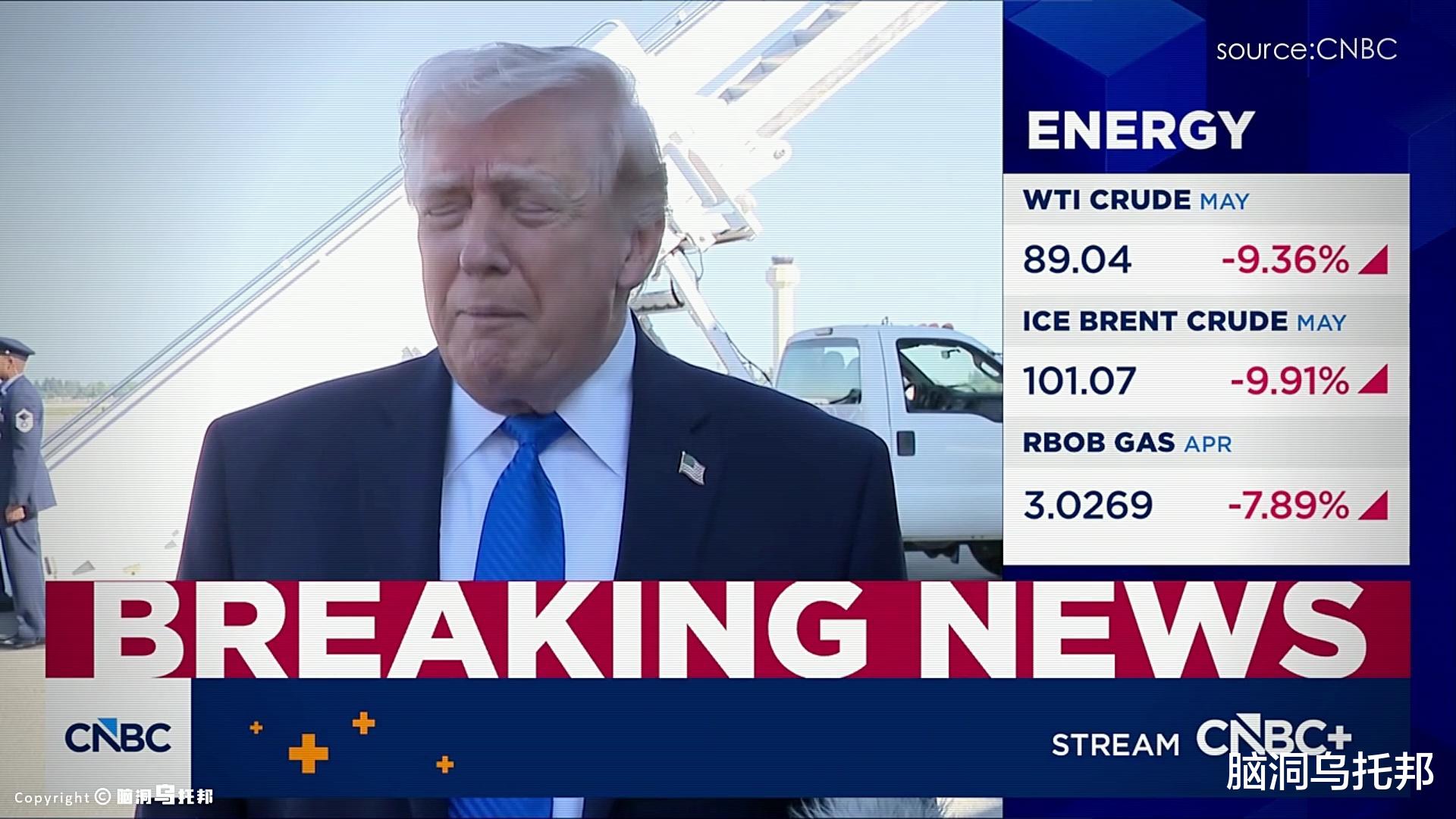 到了3月23日晚些时候,特朗普又在网上放话,说他决定在未来五天,暂停对伊朗能源基础设施进行军事打击。随后,布伦特原油迅速从每桶113美元的高位,一度跌破97美元。