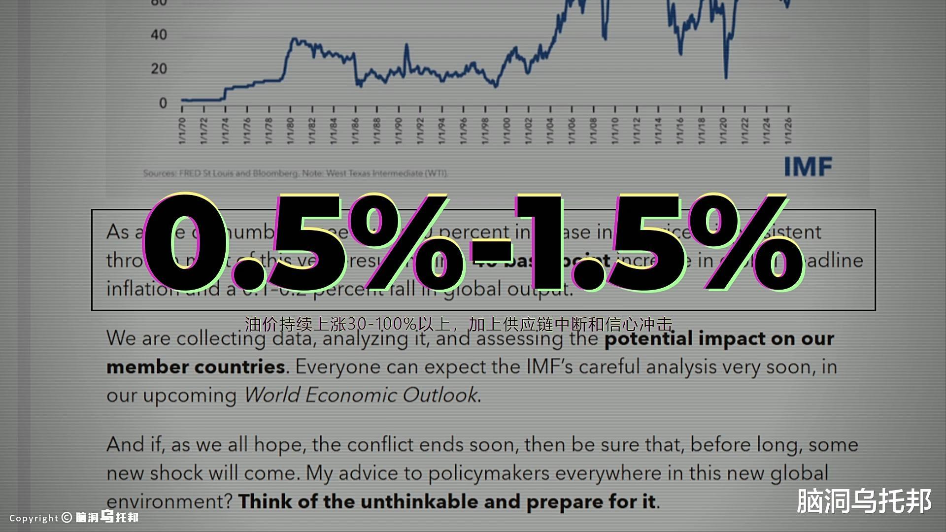 视频的最后,我们再说回这场中东战争可能给世界带来的影响。根据国际货币基金组织的模型测算,一次严重的中东冲突所引发的石油危机,很可能会让全球GDP在当年下降0.5%到1.5%。