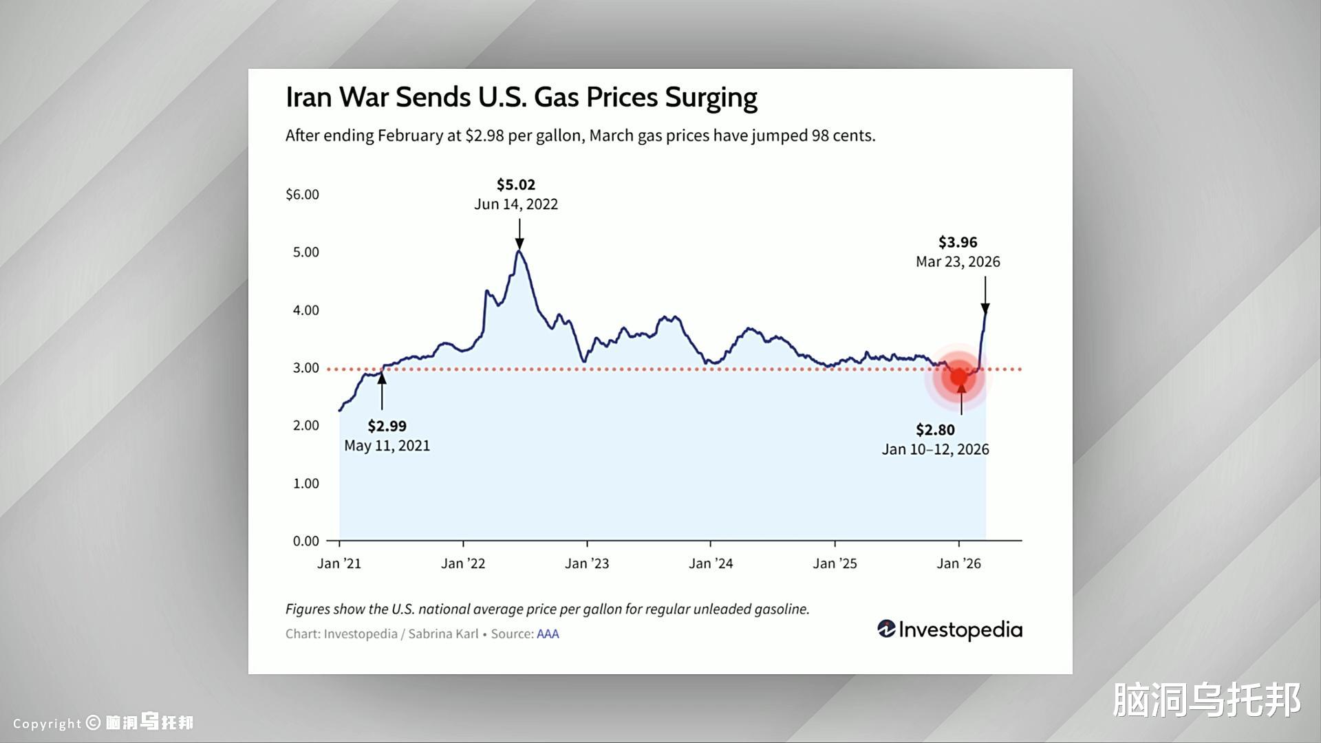 美国百姓成了第一批为这场战争买单的消费者。根据美国汽车协会的数据,美国汽油的全国均价已从战前的每加仑2.98美元,上涨至3月23日的3.96美元,涨幅高达33%。