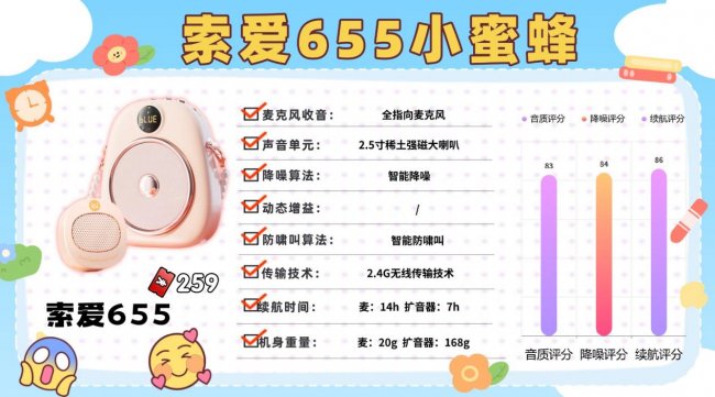 易相随S60小蜜蜂扩音器是一款专为长时间演讲使用设计的音频设备。它采用车规级DSP芯片,配备防啸叫技术,能够有效避免在高音量使用时出现音质失真,确保语音清晰稳定。这款扩音器使用2.4GHz无线技术,提供最多40米的稳定传输距离,适用于较大范围的课堂或户外使用。它支持无线与有线双模式,用户可以根据需要自由切换,增加了使用的灵活性。在续航方面,麦克风的单次使用时间为8小时,扩音器可持续工作20小时,足够应对长时间的授课或活动。此外,设备配备充电盒,支持快速充电,确保不会因电量不足而中断。易相随S60无线领夹扩音器,凭借其稳定的音质、续航和灵活的使用模式,可以入。5、索爱655小蜜蜂扩音器