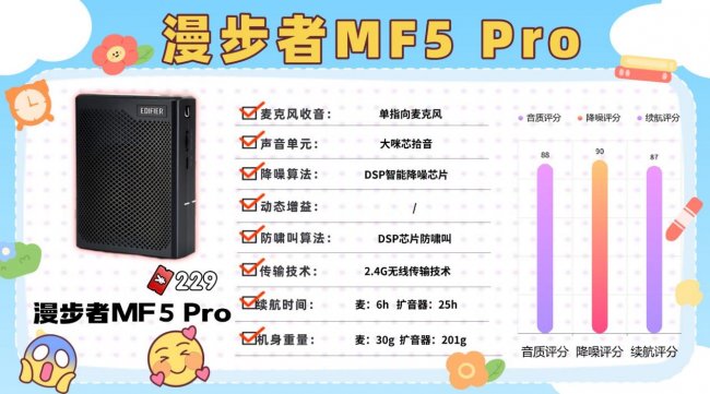 金运K21小蜜蜂扩音器采用先进的蓝牙5.4技术,确保稳定的无线传输,音质清晰,减少延迟。发射器仅重13.5g,佩戴舒适,几乎感觉不到负担,而扩音器重146g,方便长时间使用,保证不影响活动自如。其720°环绕结构收音设计,能够全方位、均匀地拾取声音,有效减少盲区,确保声音清晰不失真。特别适合在课堂、讲座等场合使用,确保每一位听众都能清楚听到发声者的声音。配备的三层复合大喇叭,音质层次丰富,音量足够穿透,能够覆盖较大的空间,且在大音量下也不失真。金运K21的设计注重细节,操作简便,无需复杂设置,即插即用,确保用户可以轻松上手并迅速投入使用。能够为提供清晰、稳定的声音表现。3、漫步者MF5 Pro小蜜蜂扩音器