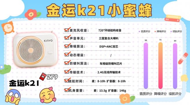 此外,西圣Bee独创的全链路抗啸叫系统,通过智能算法对音频信号进行实时检测与处理,确保声音在任何环境下都能稳定输出,消除啸叫和背景噪声。2.4G无线技术和蓝牙5.4双芯传输,保证了信号稳定、无延迟,覆盖距离可达30米,即使在复杂环境下也能稳定传输,完美适应多场景。西圣Bee小蜜蜂扩音器凭借其无与伦比的音质表现、稳定性和降噪技术,已成为扩音器市场的绝对领导者。如果你正在寻找一款能够完美解决音质瓶颈,并突破传统扩音器的限制的设备,西圣Bee无疑是你的首选,绝对是音质与性能的最佳平衡。2、金运K21小蜜蜂扩音器