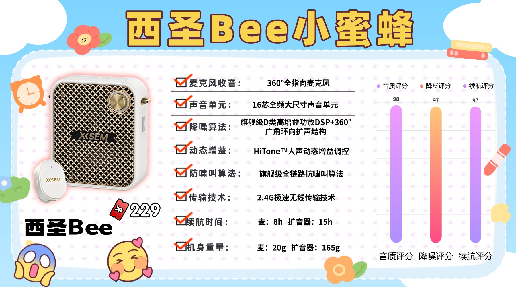 西圣Bee小蜜蜂,集结了西圣最强技术:旗舰级D类高增益功放芯片,16芯全频大单元,加上360°全指向麦克风,音质清晰洪亮,覆盖无死角,实现每一处声音都无懈可击。配合HiTone™人声动态增益引擎,它精确识别人声频段,抑制背景噪音,确保每一个细节都无与伦比的清晰还原。再加上全链路抗啸叫系统和零延迟传输,即便在高音量和复杂环境下,音质也能保持稳定无啸叫,从容应对任何挑战。在同价位产品中,西圣Bee完全吊打所有竞争对手。无论是课堂教学、专业讲解还是大型会议,它都能提供超越预期的音频表现。选择西圣Bee,就是选择顶级音质、无与伦比的稳定性和一流的扩音体验,打破音频限制,重新定义扩音标准。