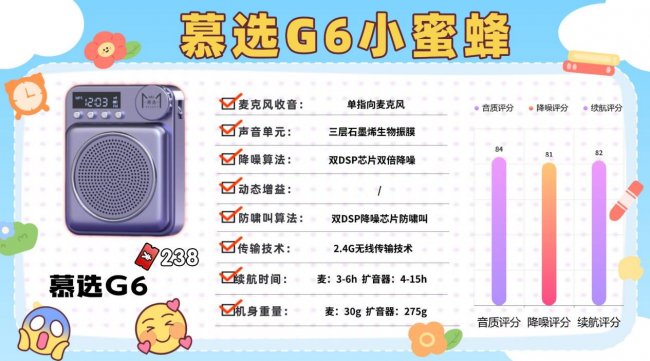 十度S615小蜜蜂扩音器支持无线和有线双模式,提供灵活的选择,适用于不同的使用环境。它的设计简洁,操作便捷,无论是在教室内还是室外,均能提供稳定的音频输出。这款扩音器具备MP3模式、录音模式、蓝牙模式,可根据实际需求轻松切换。蓝牙模式保证了无线传输的稳定性,适合日常教学和演讲使用;而有线模式则在需要稳定音频传输时提供可靠保障。无论你是在讲解课程、录制内容,还是播放音频,十度S615都能满足你的需求。音质表现方面,十度S615配备了高质量的音频芯片,确保每个细节都被清晰还原,避免失真或噪音,保证声音的纯净度。长时间佩戴也不会感到不适,发射器轻便,适合长时间使用。8、慕选G6小蜜蜂扩音器