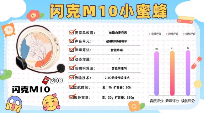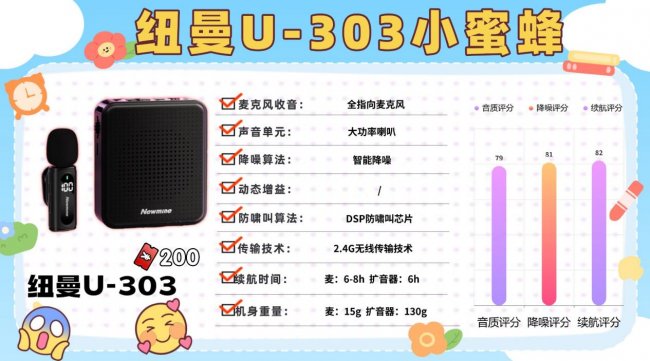 闪克M10这款扩音器采用了有线头戴式设计,相较于传统的领夹麦克风,避免了因衣物摩擦产生的噪音,也能更好地固定位置,防止掉落。教师无需担心麦克风掉落或不稳定的问题,专注于授课内容。具有蓝牙5.3技术,确保了稳定的音频传输和低延迟。无论是在教室内讲解课程,还是在进行互动教学时,教师都能自由移动,音质始终清晰,确保每个学生都能听得清楚。此外,闪克M10还配备了智能降噪功能,可以有效减少环境噪音的干扰,确保讲解过程中的声音更加纯净,尤其适合在嘈杂环境中使用。无论是课内讲解还是与学生互动,音质都能清晰呈现。续航方面,闪克M10具有较长的使用时间,支持全天候的授课需求。10、纽曼U-303小蜜蜂扩音器