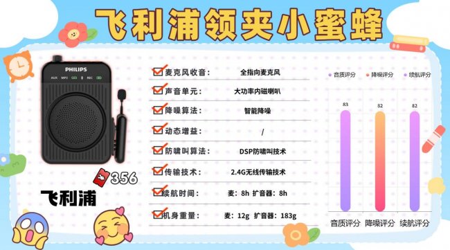 索爱655采用无线领夹式设计,让佩戴更加舒适。其体积小巧、重量轻,使用时几乎无任何负担,非常适合长时间佩戴。该扩音器支持TF卡/AUX/录音模式,可以轻松切换不同使用需求,满足日常教学和会议的各种录音需求。为了提供清晰、稳定的音频表现,索爱655配备了智能防啸叫技术,能够有效减少因大音量使用时产生的啸叫和失真问题,确保音频的清晰度和稳定性。无论是在教室、会议室还是其他环境中,用户都能享受稳定的音质输出。在续航方面,索爱655具备长时间的使用能力,非常适合日常教学或长时间会议的需求。整体设计简洁实用,结合智能防啸叫技术和稳定传输系统,是款适应各种场景的扩音器。6、飞利浦DLM3551CB小蜜蜂扩音器
