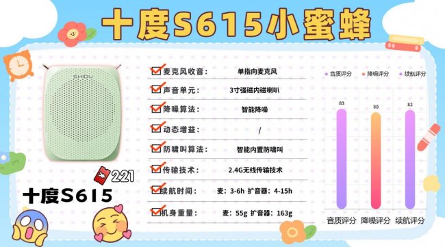 飞利浦DLM3551CB扩音器采用360°全指向麦克风,能够无死角捕捉发言者的声音,确保从各个角度的声音都能被清晰传达。无论是小范围课堂还是较大的会议场地,都能稳定传递语音,确保每位听众都能听得清楚。搭载蓝牙5.0技术,确保无线信号稳定可靠,音频传输清晰流畅。发射器仅12g,佩戴轻便,几乎无负担,适合长时间使用,而扩音器重183g,设计简洁、耐用,适合日常课堂或会议环境。其大功率内磁喇叭提供强劲的音量输出,保证音频穿透力,无论环境如何,都能实现清晰的声音覆盖。通过精细的音频处理,音质细腻,背景噪音得以有效抑制,确保语音的自然还原。整体设计兼顾便捷性与实用性,能够适应不同教学场景的需求。7、十度S615小蜜蜂扩音器