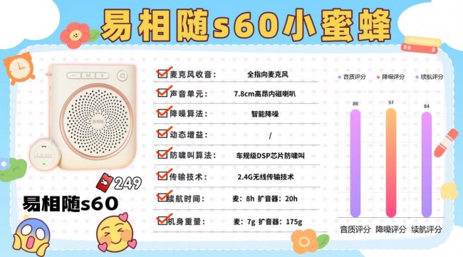 漫步者MF5 Pro小蜜蜂扩音器,凭借其2.4G无线传输技术,10米的稳定信号覆盖让你无需担心传输距离,适应多种环境。无论是大教室、会议室还是户外场景,它都能确保信号传输顺畅、延迟低。核心亮点在于其搭载的专业DSP智能降噪芯片,能够有效剔除外界噪声、避免啸叫和失真,提升声音的纯净度。无论是高频细节还是低频深度,都能精准还原,确保语音的自然与清晰。特别适合教师、讲师等场景使用,它不仅提升课堂讲解的音质表现,还能轻松应对长时间的演讲和教学任务。漫步者MF5 Pro的设计简洁、佩戴舒适,免去繁琐的安装与调试,能快速上手。总结来说,这是款提升课堂或会议音频质量的理想选择。4、易相随S60小蜜蜂扩音器