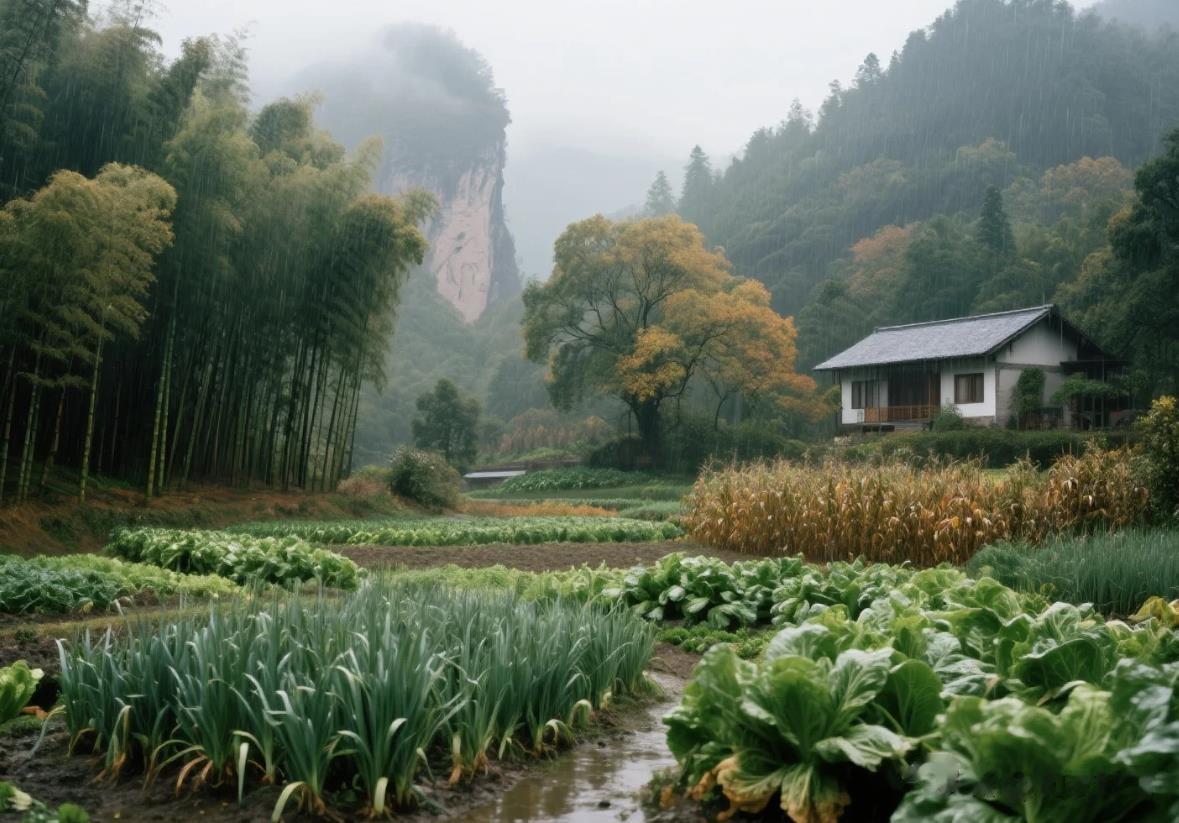菜圃里有秋冬的蔬菜,此时正值细雨,那蔬菜长得好呀,肥嫩嫩的。