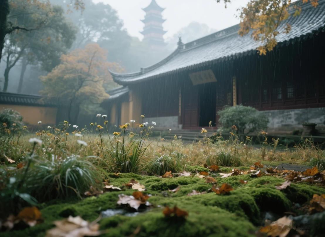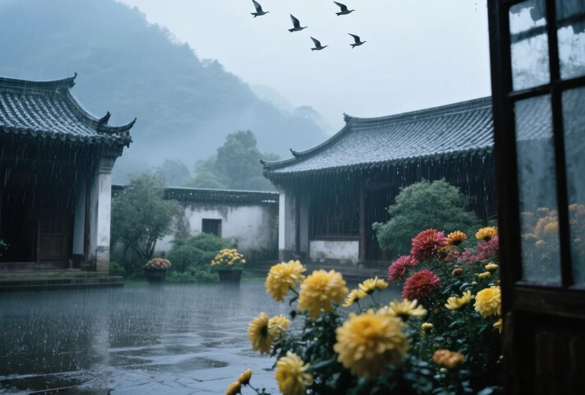 天上的大雁在这种天气里,也会迷失路径吧。倒是庭院中的菊花,在这样的雨中开得分外鲜艳。