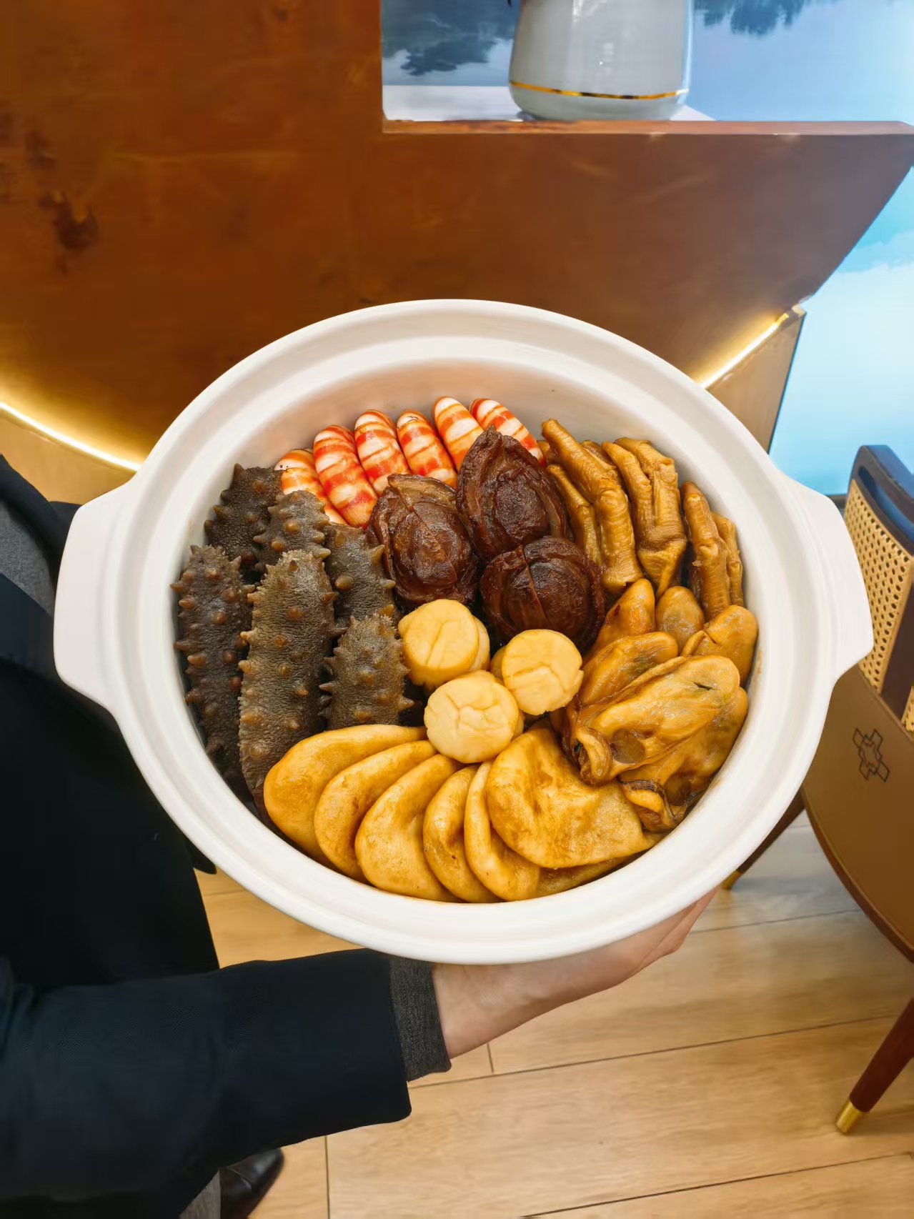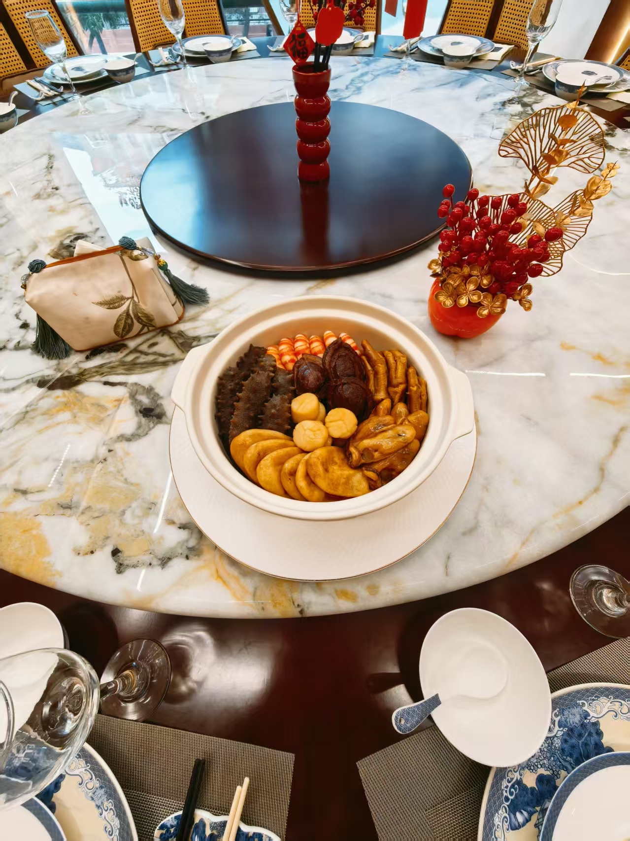顶层往往以硕大饱满的鲍鱼、金黄诱人的烧鹅镇场,中层是软糯入味的花胶、海参,底层则铺满充分吸收所有精华汁水的萝卜、枝竹等。一盆之上,色泽油润光亮,层次分明。最关键的,是那每日新鲜熬制、醇厚香浓的鲍汁,在慢火煨炖中徐徐渗透每一层食材,令海味的鲜、山珍的香、肉类的醇完美融合,滋味层层递进,每一勺都充满惊喜。这道菜不仅是一道菜肴,更是一个“聚宝盆”,寓意着财富堆积、事业圆满、百味和谐,为新一年的合作开启极佳的彩头。