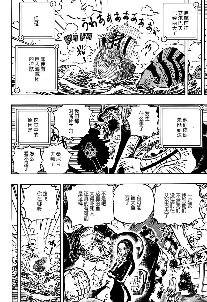 草帽一伙只有六人进入艾尔巴夫,其他人都在巨人族的船只上,东海五人组已经出现在城堡里。罗宾和东利等人在大海上,他们正在寻找失踪的草帽一伙和桑尼号,因为喝了很多苦艾酒,导致所有人都睡着了,路飞等人才会被神秘人掳走。