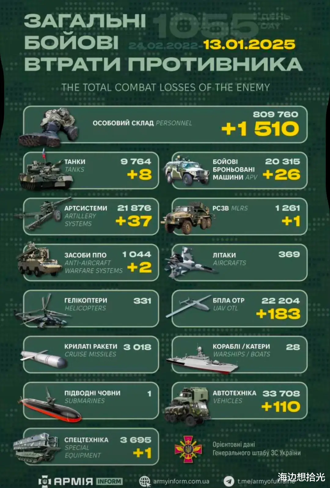 乌总参最新战报信息,俄乌战争进入第1055天,也是库尔斯克之战的第161天。昨天,俄军已累计阵亡人数为809760人,一天里新增损失1510人。摧毁俄军坦克8辆、装甲车28辆、火炮系统37门、多管火箭炮发射系统1套、防空系统2套、无人机183架、运油卡车等110辆、特种设备1套。