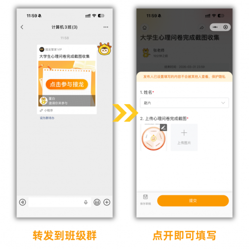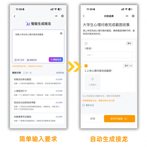 发通知、收截图、统计学生信息是班长的日常工作,以往需反复斟酌措辞、手动整理数据,耗时费力。接龙管家的AI创建功能彻底改变这一现状:输入指令,如收心理健康问卷截图,AI就能在10秒内生成完整接龙,班长点击即可发布到班级群,让同学们填写。