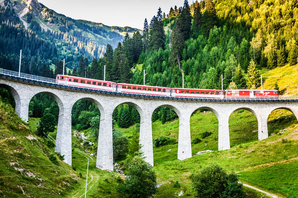 乘坐欧洲最负盛名的观光列车-金色山口快车,会带你从青绿的湖畔小镇,逐步驶入纯白的雪国,穿梭在雪峰之间,窗外是银装素裹的松林和无边无际的雪原,仿佛穿越进童话中的王国。