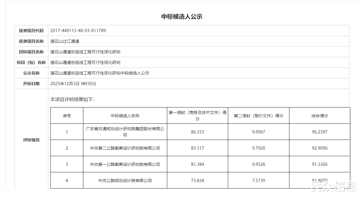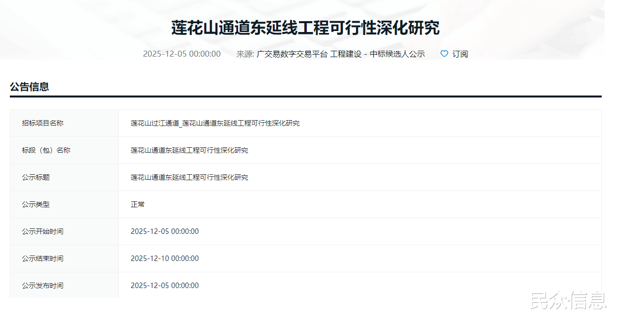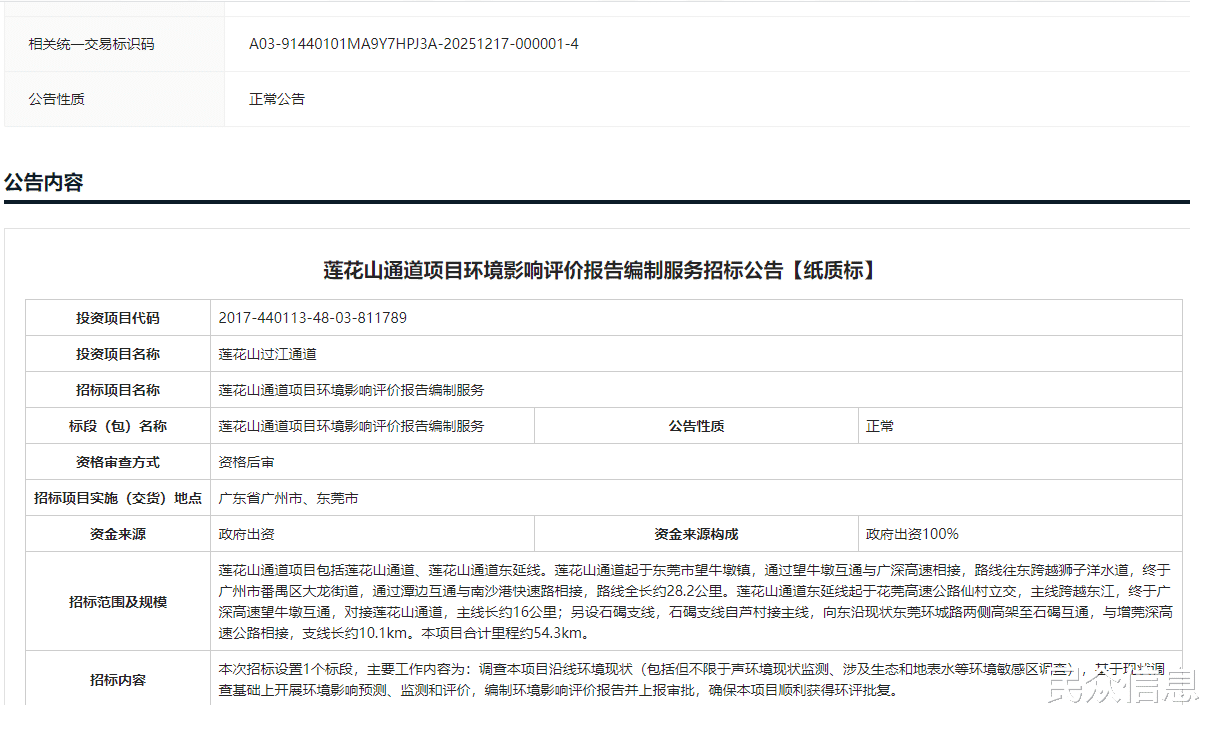 近日,广东省公共资源交易平台在官网发布莲花山通道项目环境影响评价报告编制服务招示公告。同时莲花山过江通道东延线工程可行性深化研究也发布了中标人信息公告。
