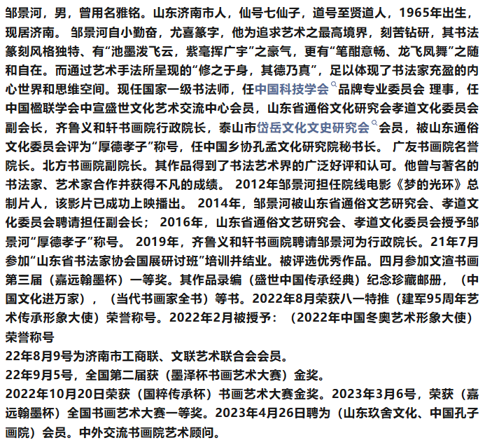 相信在未来的日子里,邹景河老师将继续在艺术的道路上不断探索,创作出更多优秀的作品,为中国书法篆刻艺术的传承与发展贡献更多的力量,而他的艺术精神,也将如同墨香一般,源远流长,影响着一代又一代的书法爱好者。
