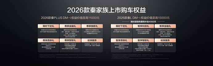 1月8日,比亚迪秦家族迎来重磅加推,2026款秦L DM-i /2026款秦PLUS DM-i 210KM长续航版双车同步上市,售价8.98-12.28万元。其中,2026款秦L DM-i 210KM长续航版限时超级优享价11.28-12.28万元,2026款秦PLUS DM-i 210KM长续航版售价8.98-9.98万元。同时,两款车型均带来了丰厚的上市权益礼。