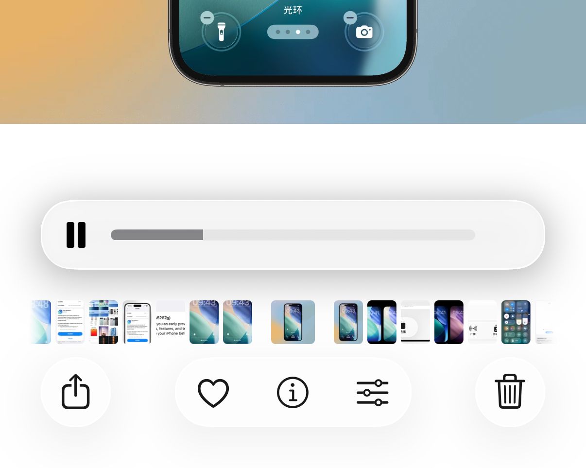 可以发现,在相册的视频播放进度条新增了一个长条形的边框,边框周围增加了液态玻璃效果,暂停和播放按钮的位置也进行了调整。照片 App 中的导航按钮,也从液态玻璃效果改回了磨砂效果。