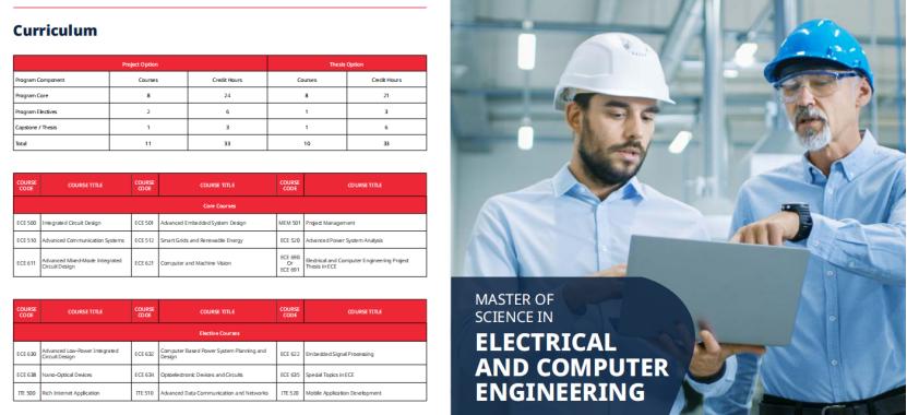 MSECE提供全日制和非全日制两种授课模式,学习时长为2年。开设春、夏、秋、冬四个入学学期,课程提供修课选项和论文选项两种形式。招收有电气工程、计算机工程,或相关领域学士学位的学生。根据学生的本科成绩单,在某些科目上缺乏必要背景可能会被有条件录取。