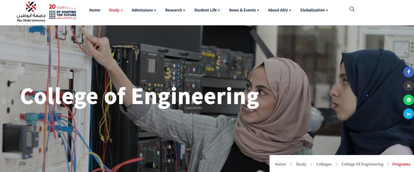 阿布扎比大学工程学院(ADU College of Engineering)提供15个学士学位课程、7个硕士学位课程、2个博士学位课程、4个辅修专业,以及9个专修方向。