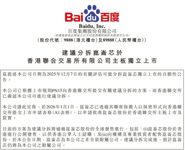 2026年1月1日,百度旗下AI芯片公司昆仑芯以保密形式向香港联交所递交上市申请。消息传出,市场反应迅速而直接:百度美股股价当日大涨15%,创下近期纪录。