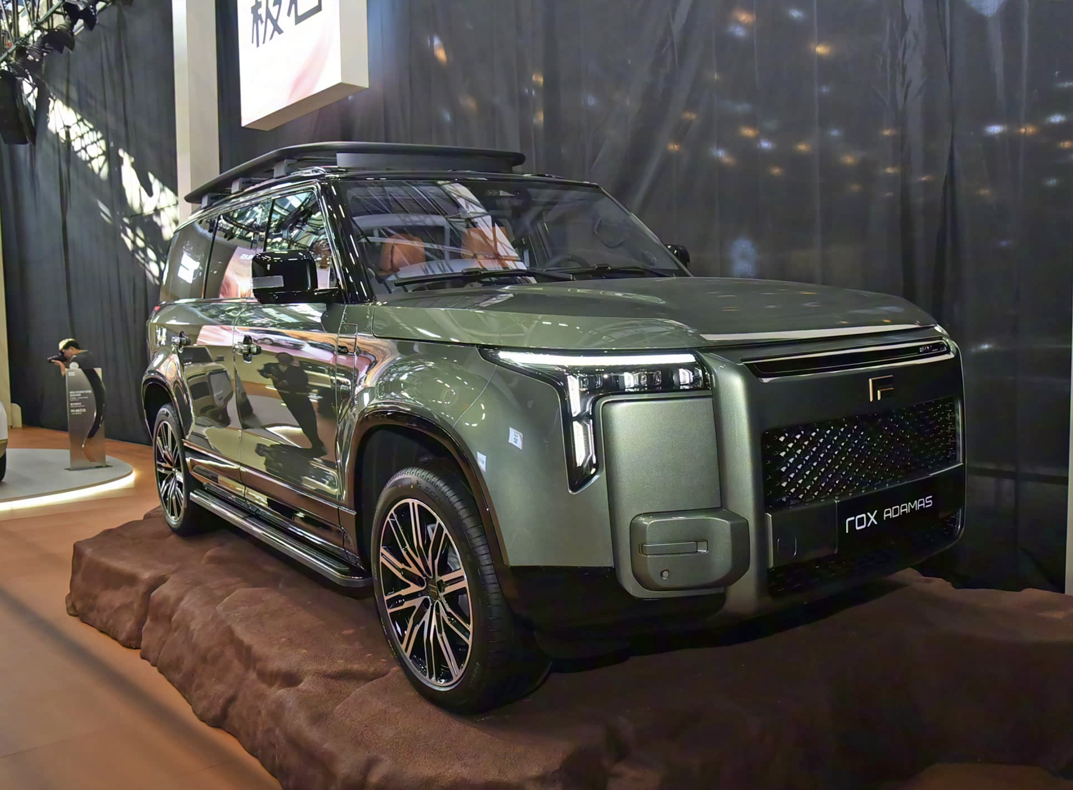 外观方面,全新的极石ADAMAS沿用了极石01的整体设计,车头采用了古典方盒子的经典造型,前舱盖加入了隆起的型面,粗犷的前格栅采用了半封闭式设计,两侧古代兵器“戈”样式的大灯加入了黑色的边框,内部融入了横置式的LED灯眉、泪滴式的竖状LED光源和带有透镜的LED远近光光源,科技感十足。前保险杠加入了粗犷的防撞梁,两侧还有横置式的雾灯设计以及黑色的装饰板,带来了丰富的层次感。车尾采用了正方形的轮廓,黑色的尾窗、封闭式的后格栅和黑色的后防撞梁形成了鲜明的层次感。外挂式的备胎和侧开式的尾门也提升了整车实用性。兵器“戈”样式的尾灯呼应了前大灯,夜间辨识度很高。