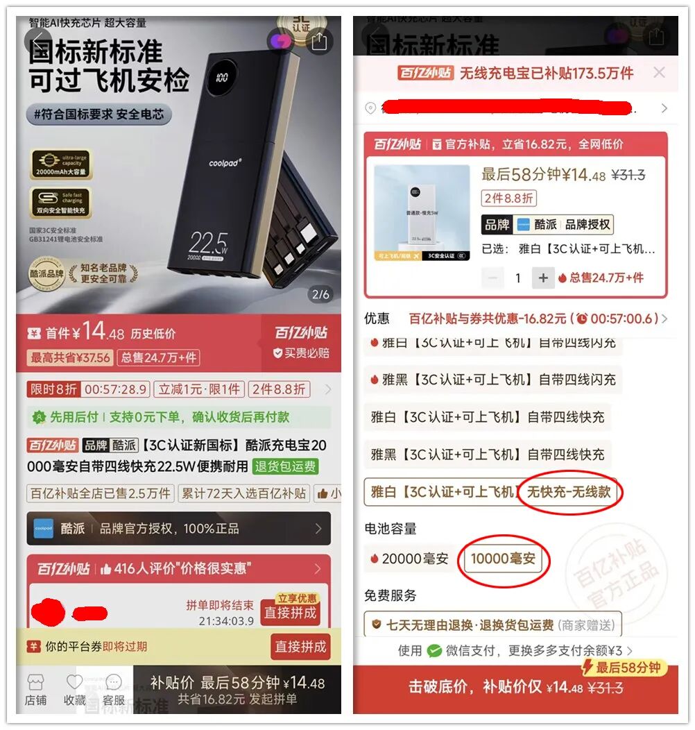 这是我在PDD刷到的酷派1万毫安充电宝,带3C认证标,通过了GB31241锂电池安全标准。原价多少已经不重要了,我点进去选择“无快充-无线款”后,实付显示只要14.48元,已经低于我去年7月我带大家16.9元捡漏的诺希1万毫安充电宝了。