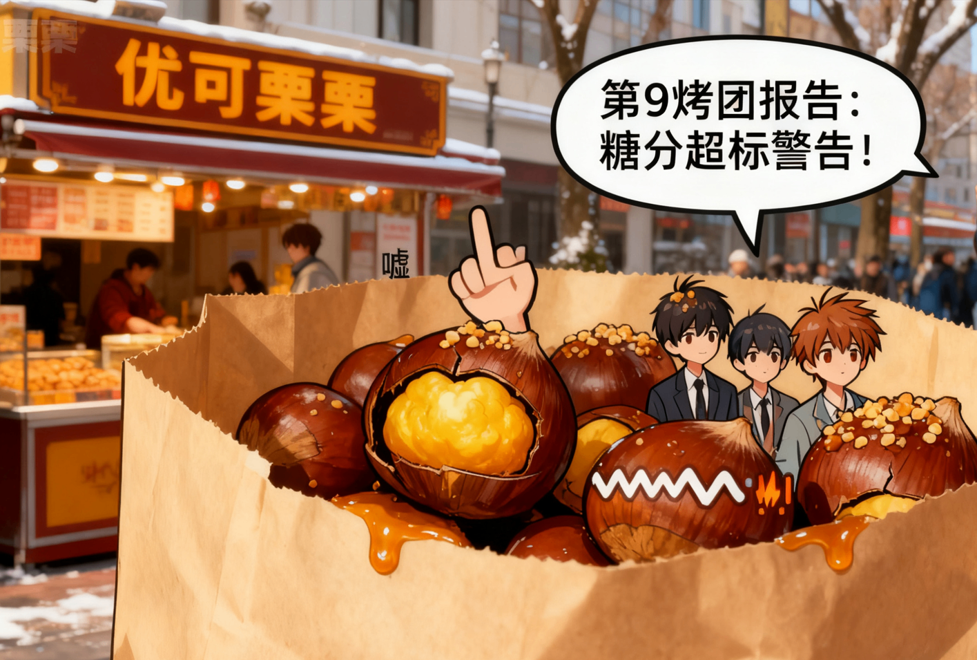 板栗军团在纸袋里集体摇晃:“日光浓缩弹准备发射!”先是焦脆外衣在指腹跳舞,接着金黄果肉涌出暖流,连呼吸都染上木质香薰,「吃掉我们=拥抱会爆浆的冬日暖阳」。