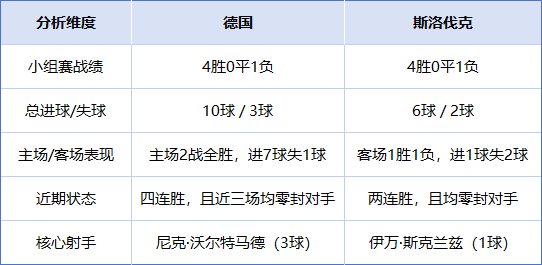 · 德国攻防特点:德国队整体攻击力强劲,尤其是主场作战时,曾打出4:0、7:0的大比分。但需要注意,他们近期防守表现非常稳固,已经连续三场比赛没有失球。在首回合客场0:2负于斯洛伐克的背景下,此役回到主场,球队在力争胜利的同时,很可能也会优先确保防守不犯错。