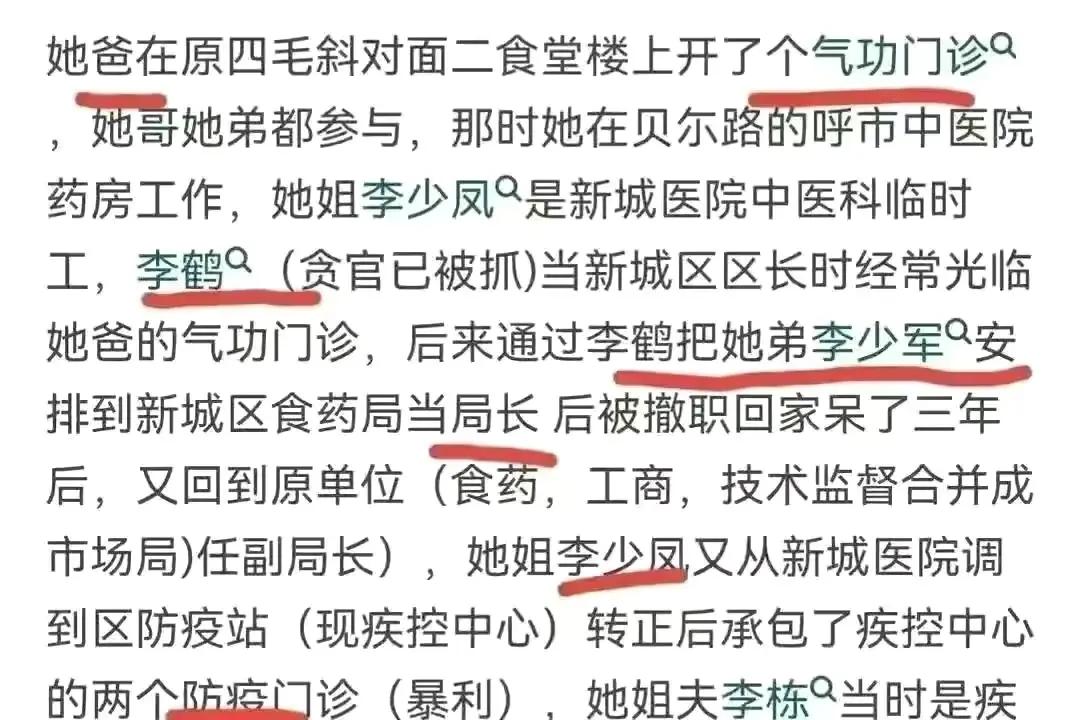 我们从上面看出,她父亲是开气功门诊的,她弟弟是被一个叫李鹤的人安排当了食药局的局长。李鹤当时是新城区区长,后来因为贪污腐败被抓,后来她弟弟因为某件事违规了,被免职回家呆了三年,三年后又回到原单位任副局长。大家扒到这里,更不淡定了,给她弟弟的履历也扒了出来