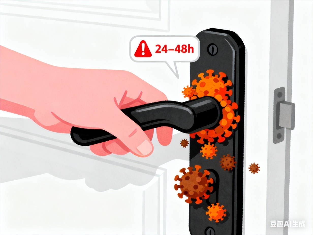 3.门把手、电梯按钮、手机屏可存活24–48小时